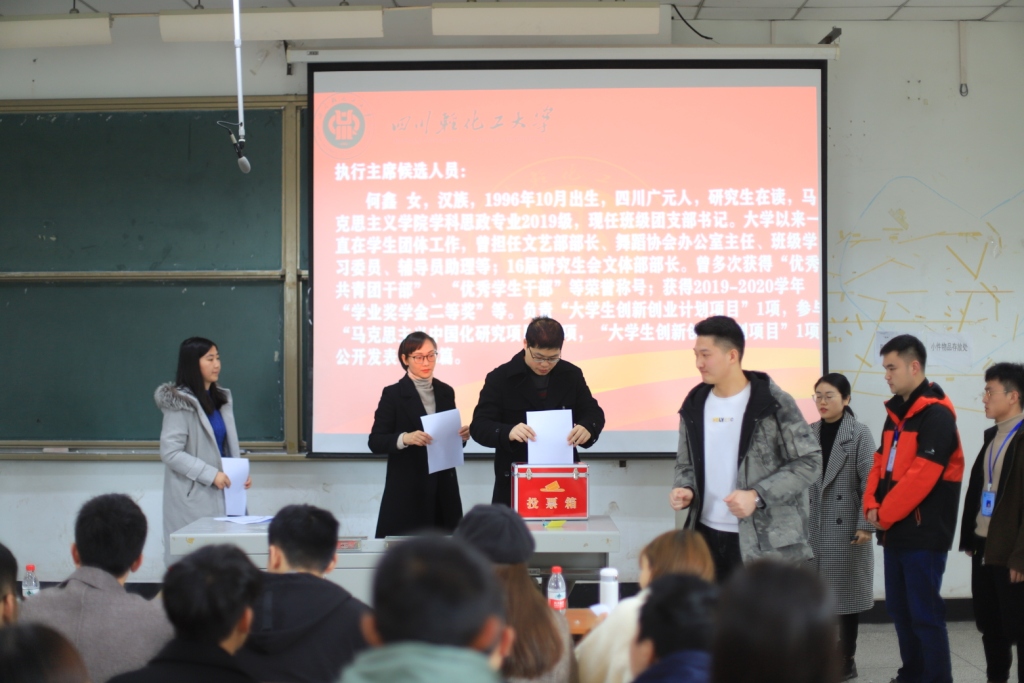 大会听取并通过了《四川轻化工大学研究生会章程(草案)》,民主投票选举产生了新一届研究生会主席团成员和执行主席。