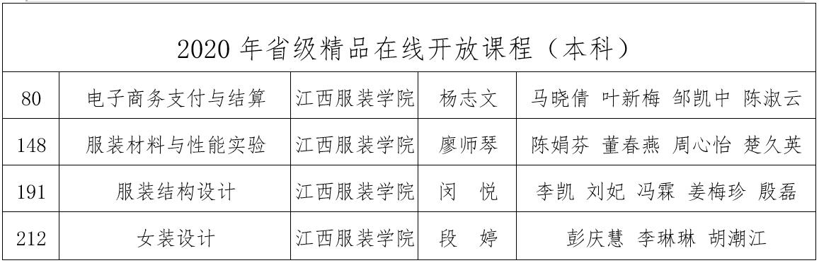 新闻中心讯:近日,江西省教育厅下发《关于公布2020年省级精品在线开放课程认定结果的通知》(赣教高字〔2020〕24号)文件,我校4门课程被认定为省级精品在线课程,分别是杨志文教授负责的《电子商务支付与结算》、廖师琴老师负责的《服装材料与性能试验》、闵悦教授负责的《服装结构设计》、段婷教授负责的《女装设计》。此次,江西省共认定了省级精品在线开放课程198门,我校立项数在民办本科院校中名列前茅。