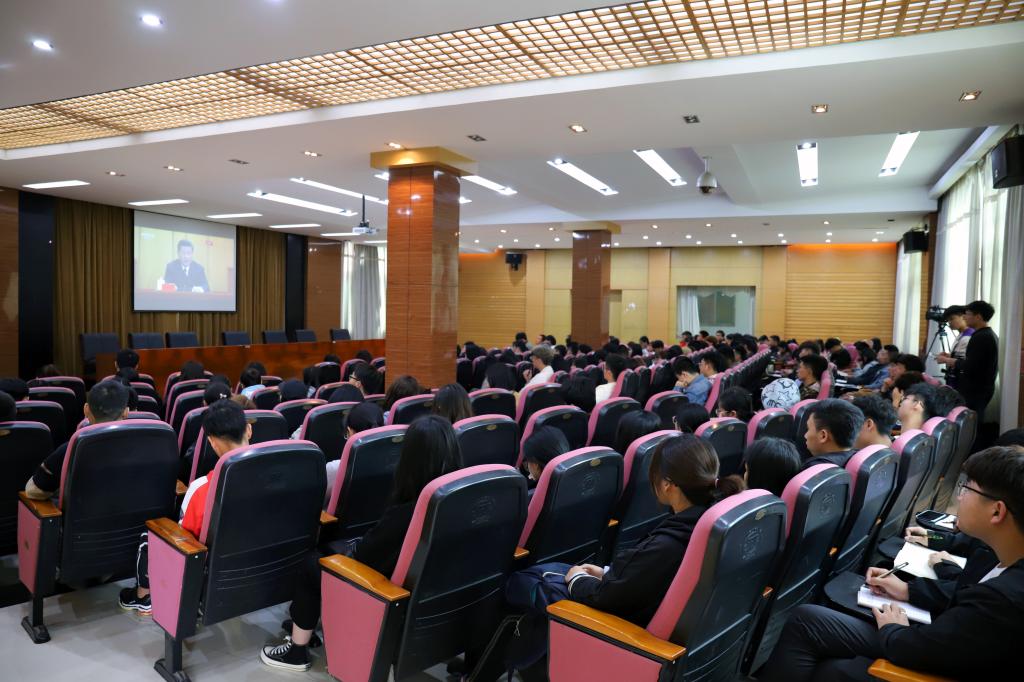 服装报讯(图/文 万强)4月30日上午10时30分,党中央纪念五四运动100周年大会在人民大会堂隆重举行。中共中央总书记、国家主席、中央军委主席习近平出席大会并发表重要讲话。我校党委、团委基层党、团组织负责人,团学干部和团员代表近200人在行政楼一楼报告厅集中观看了大会直播。