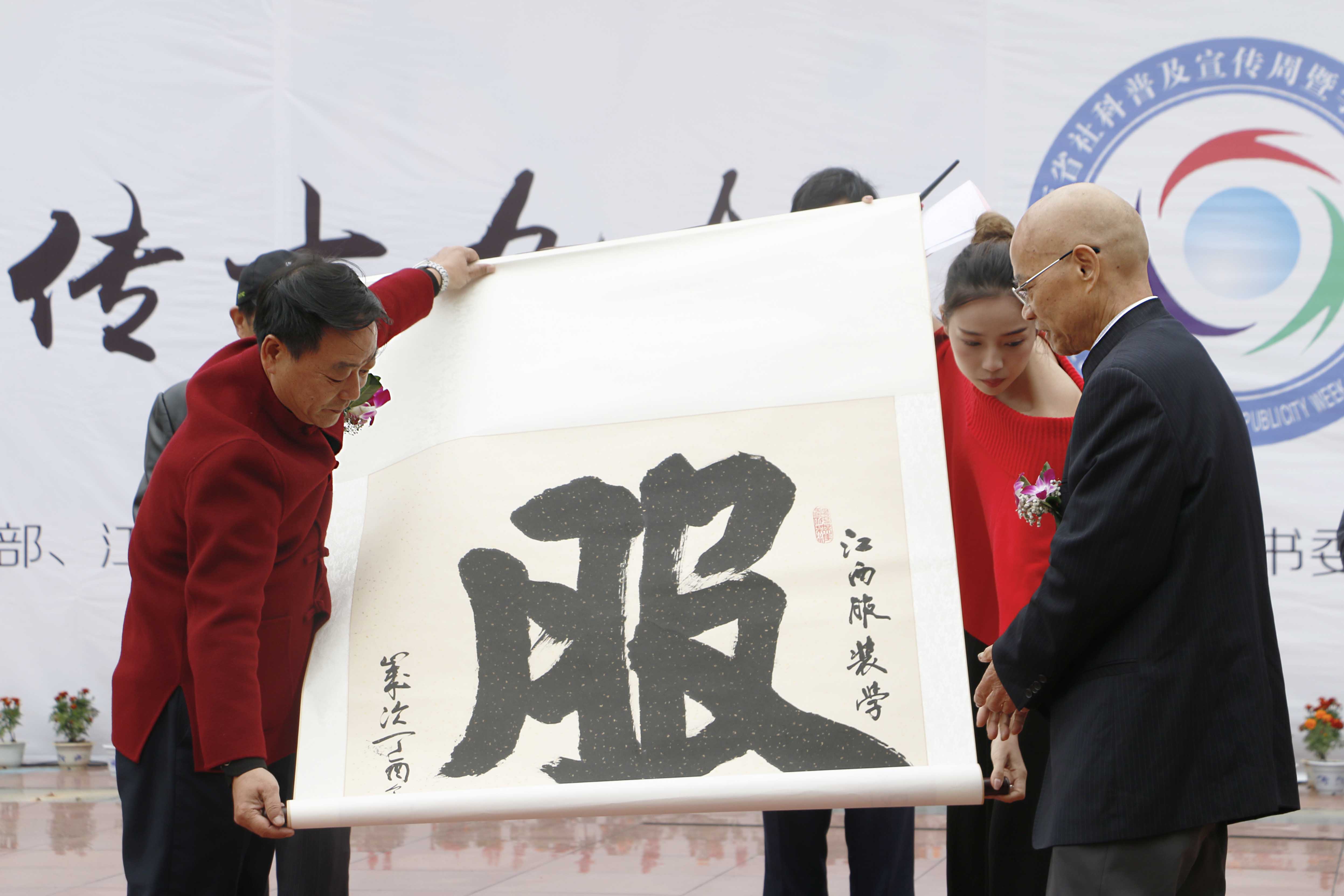 服装报讯(记者/范国庆 实习记者/黄海蓉 摄影记者/张蔷薇) 由省委宣传部、省社联举办的2017年江西省社科普及宣传周暨学术活动周项目——第三届江西榜书精品校园巡展于11月11日在全国社科普及宣传基地——我校服装博物馆隆重开幕。