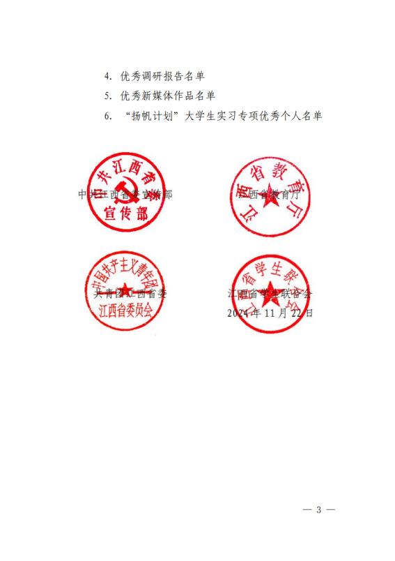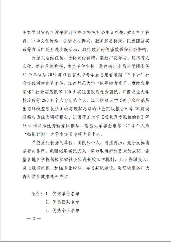 新闻中心讯(供稿/ 校团委)2024年6月,省委宣传部、省教育厅、团省委、省学联联合下发通知,部署2024年江西省大中专学生志愿者暑期文化科技卫生“三下乡”社会实践活动,引导和帮助广大青年学生上好与现实相结合的“大思政课”,在社会课堂中“受教育、长才干、作贡献”,争做有理想、敢担当、能吃苦、肯奋斗的新时代好青年。万象城平台共组织24支队伍、200余人奔赴南昌、上饶、赣州等地开展社会实践活动。江服青年光彩夺目,佳绩连连。我校团委荣膺全省优秀单位,此外还斩获2个优秀实践团队、4个先进个人、1个优秀新媒体作品以及1个扬帆计划先进个人等多项荣誉。