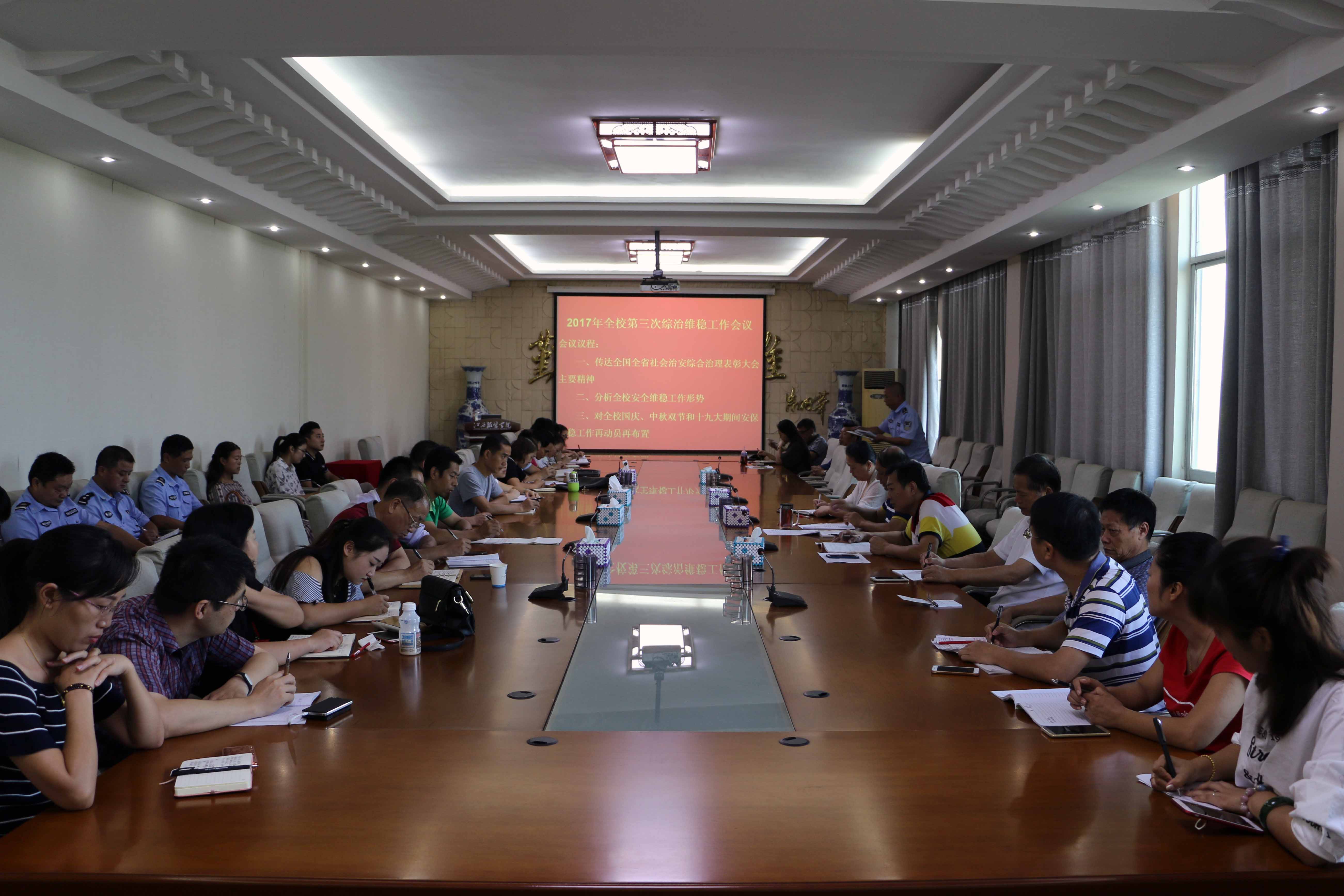 9月30日,我校在行政楼二楼会议室召开了“十九大”期间安全维稳工作专题会议,会议由校党委副书记高建国主持。 会上,高建国副书记传达了上级领导部门关于做好党的十九大期间安全维稳工作的会议、文电精神,按照上级要求,结合我校实际情况,对学校的维稳工作做了周密部署。十九大维稳责任重大,全体教职工一致表示,要统一思想,提高认识,增强政治责任感,以临战姿态做好各项维稳安保工作,各部门间密切配合,确保十九大期间学校的安全稳定和谐,创造良好的校园环境和教育教学秩序,以优异成绩向十九大献礼。