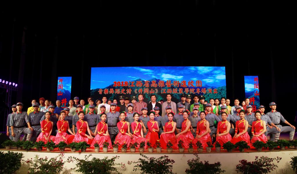 服装报讯 为认真贯彻落实习近平新时代中国特色社会主义思想和十九大精神,落实立德树人根本任务,传承红色基因,提高学生艺术修养和文化素质,10月29日晚,由省教育厅主办的“高雅艺术进校园”活动——井冈山大学百名大学生出演的音乐舞蹈史诗《井冈山》走进我校,在霓裳宫为我校师生带来一场高雅文化艺术的盛宴。校领导陈东生、高建国、胡放、易城,井冈山大学艺术学院院长彭一敏与全校3000余名师生共同观看了演出。