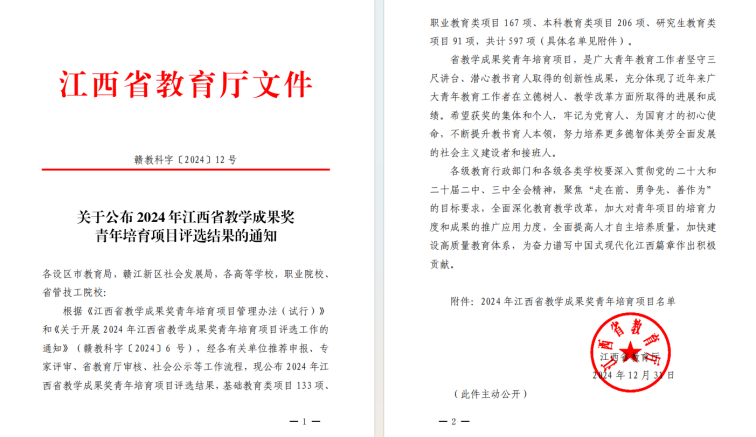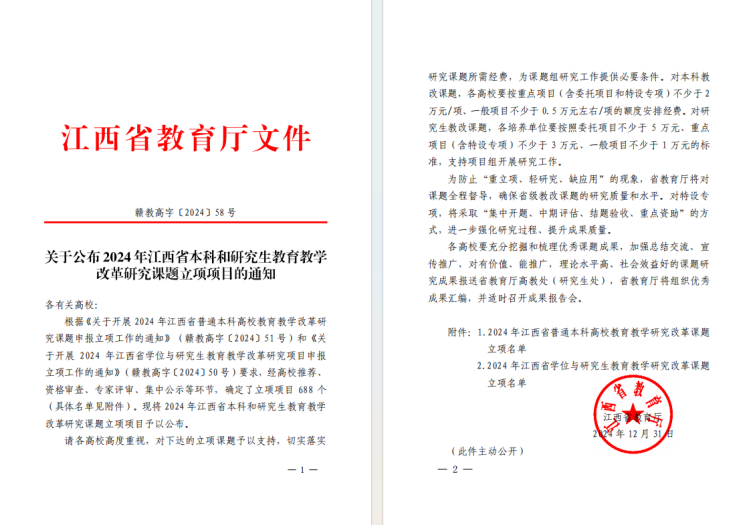 江西省教育厅公布了2024年江西省普通本科高校教育教学研究改革课题立项名单,其中我校李允耕、张红、吴琴琴老师申报的教育教学改革研究课题项目获得立项。