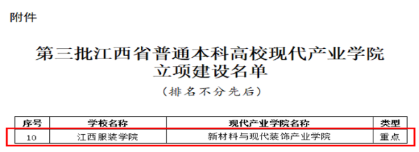 近日,江西省教育厅、江西省发展和改革委员会、江西省工业和信息化厅联合下发的《关于公布第三批江西省普通本科高校现代产业学院立项建设项目名单的通知》,我校申报的“新材料与现代装饰产业学院”成功获批第三批江西省现代产业学院立项建设重点项目。