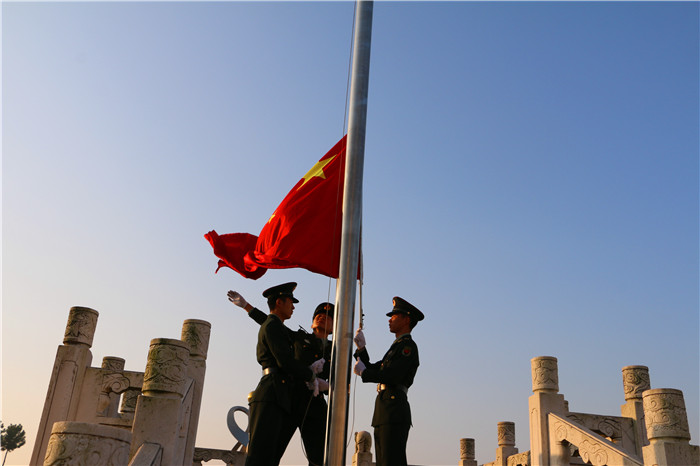 在场师生的注目中,英姿飒爽的国旗护卫队队员护送鲜艳的五星红旗进场,伴随着庄严的《中华人民共和国国歌》,五星红旗冉冉升起,迎风飘扬。在场的每一个人向国旗行注目礼,深怀着对祖国无限的热爱和崇高的敬意。
