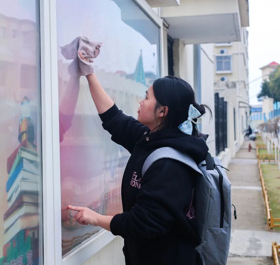 党委宣传部大学生记者团的志愿者化身“校园美容师”,开展了清洁校园宣传栏的义务活动。同学们不顾凛冽寒风,认真的擦拭着每一个宣传栏,将雷锋精神内化于价值追求,外化于自觉行动,以实际行动诠释雷锋精神的时代价值,引领学雷锋活动,为审核评估活动顺利进行贡献青春力量。