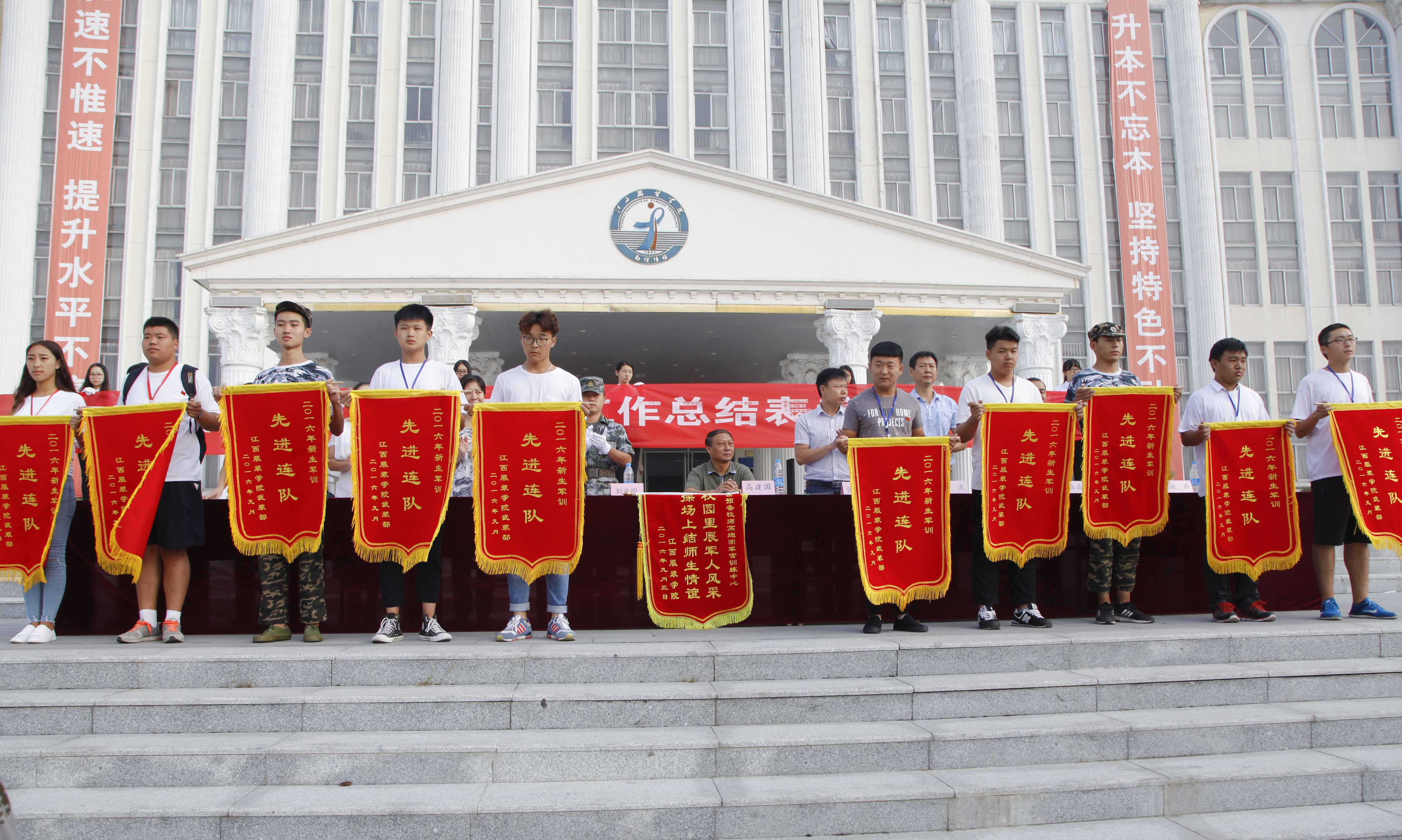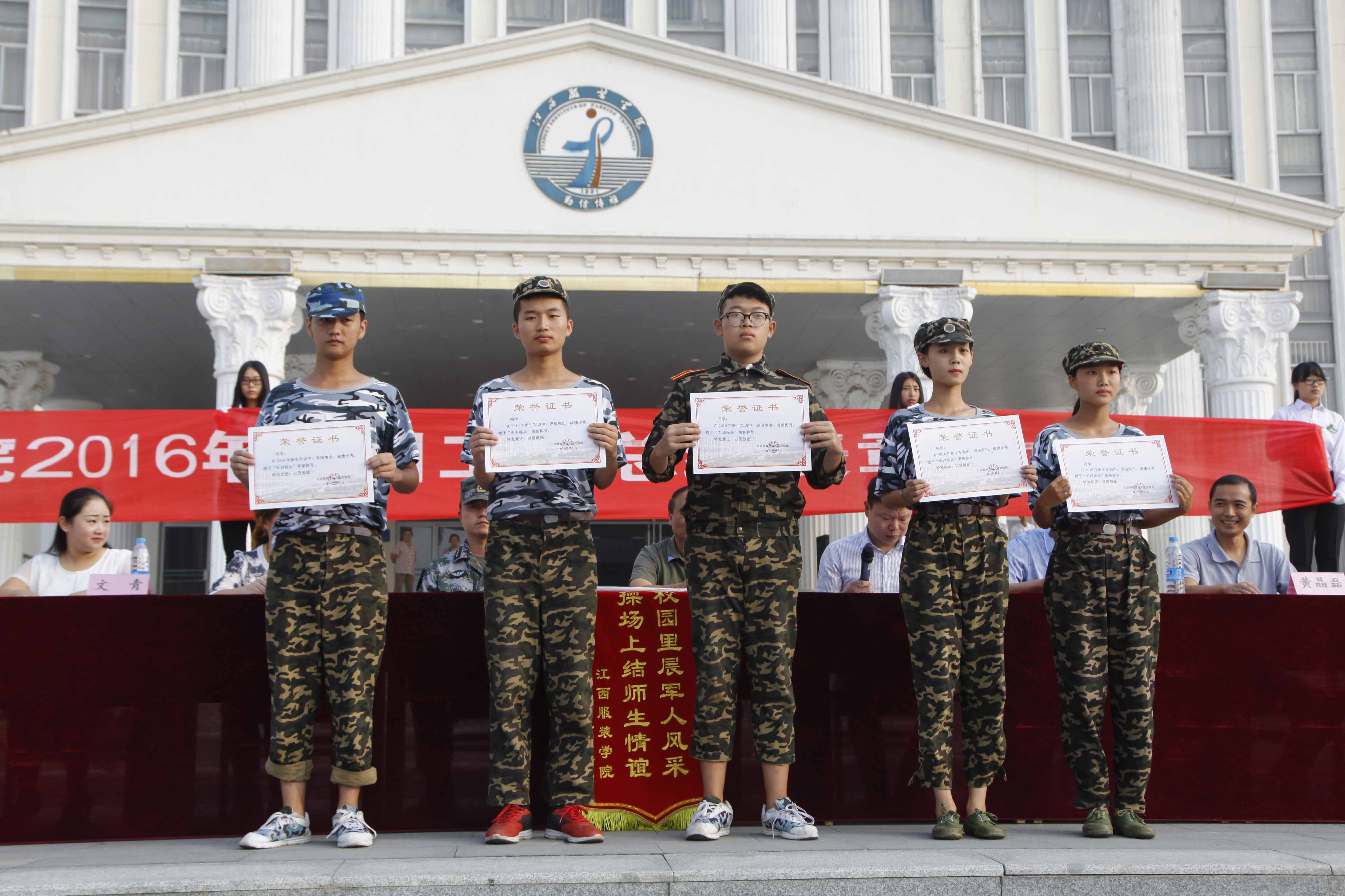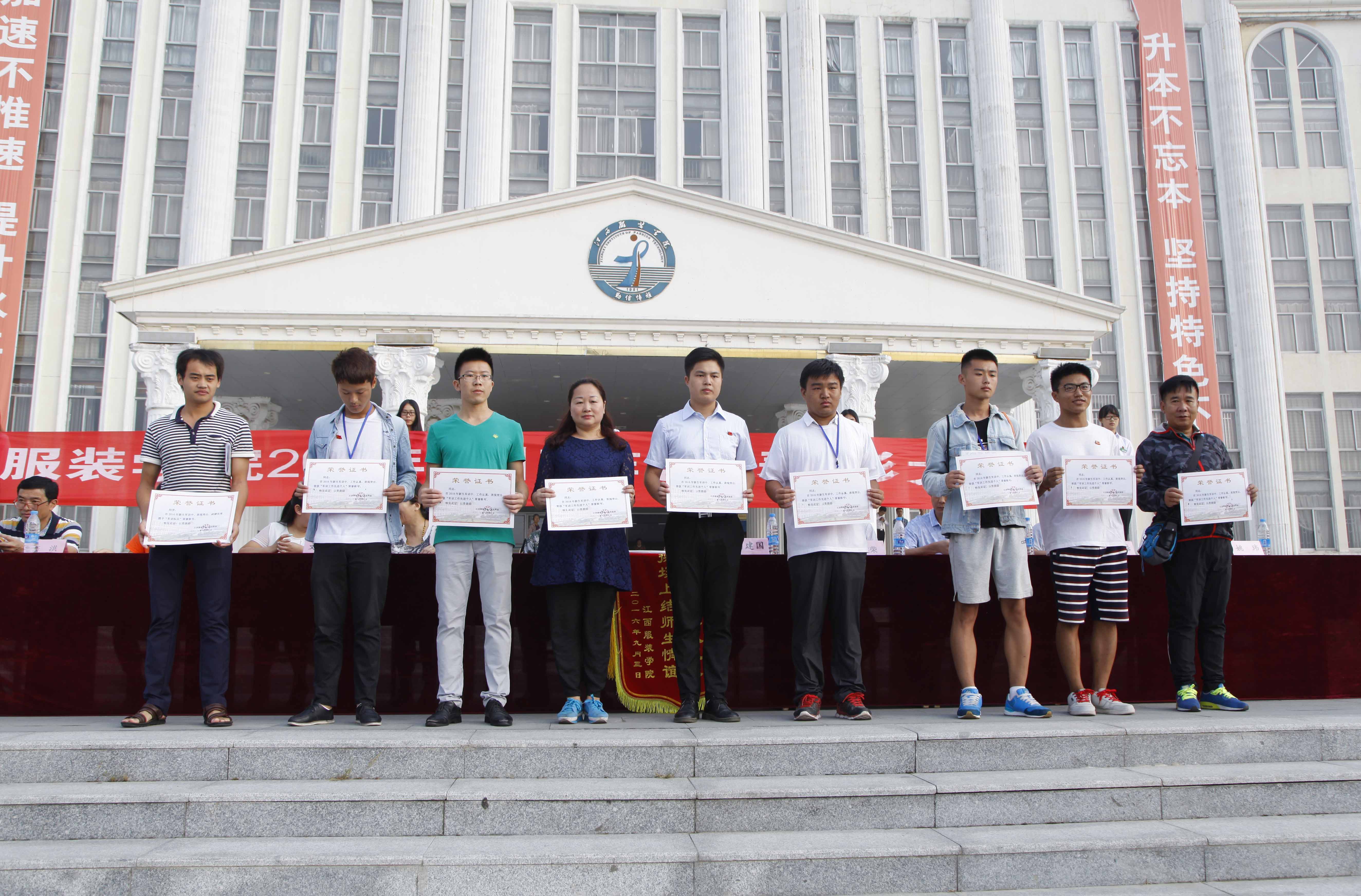 随后,服装工程分院党总支副书记文青宣读了《2016年军训工作先进连队、先进个人和军训标兵表彰决定》。授予服装设计分院军训一连等10个连队为“2016级新生军训先进连队”荣誉称号;授予服装设计分院彭晓健等19名同志为“2016级新生军训先进个人”荣誉称号;授予服装设计分院宋奕璇等947名同学为“2016级新生军训标兵”荣誉称号。校领导为获奖团体及个人赠送锦旗、颁发荣誉证书。