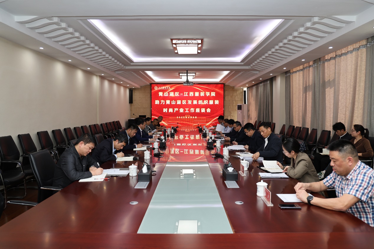 新闻中心讯(文/图 万强)4月8日下午,我校与南昌市青山湖区共同举办的“助力青山湖区发展纺织服装时尚产业工作座谈会”在学校行政楼二楼会议室召开。南昌市青山湖区区委副书记、区长杨育星,区政府副区长彭小建及区直相关部门负责人出席会议。我校党委副书记、监事长唐新强,副校长贾丽霞,校长助理马国照,双创学院、科技产业处、教务处、就业处等相关职能部门负责人参加会议。此次座谈会旨在深化校地合作,共同推动青山湖区纺织服装时尚产业的升级与发展。座谈会由校党委副书记唐新强主持。