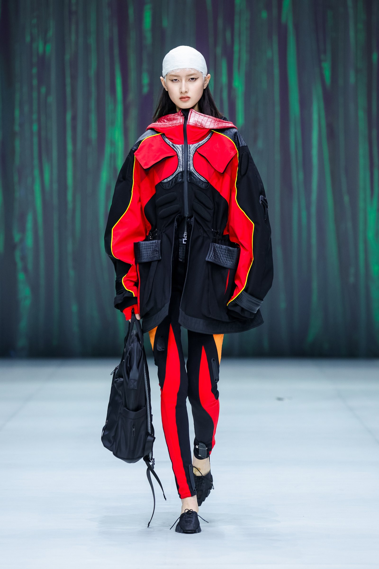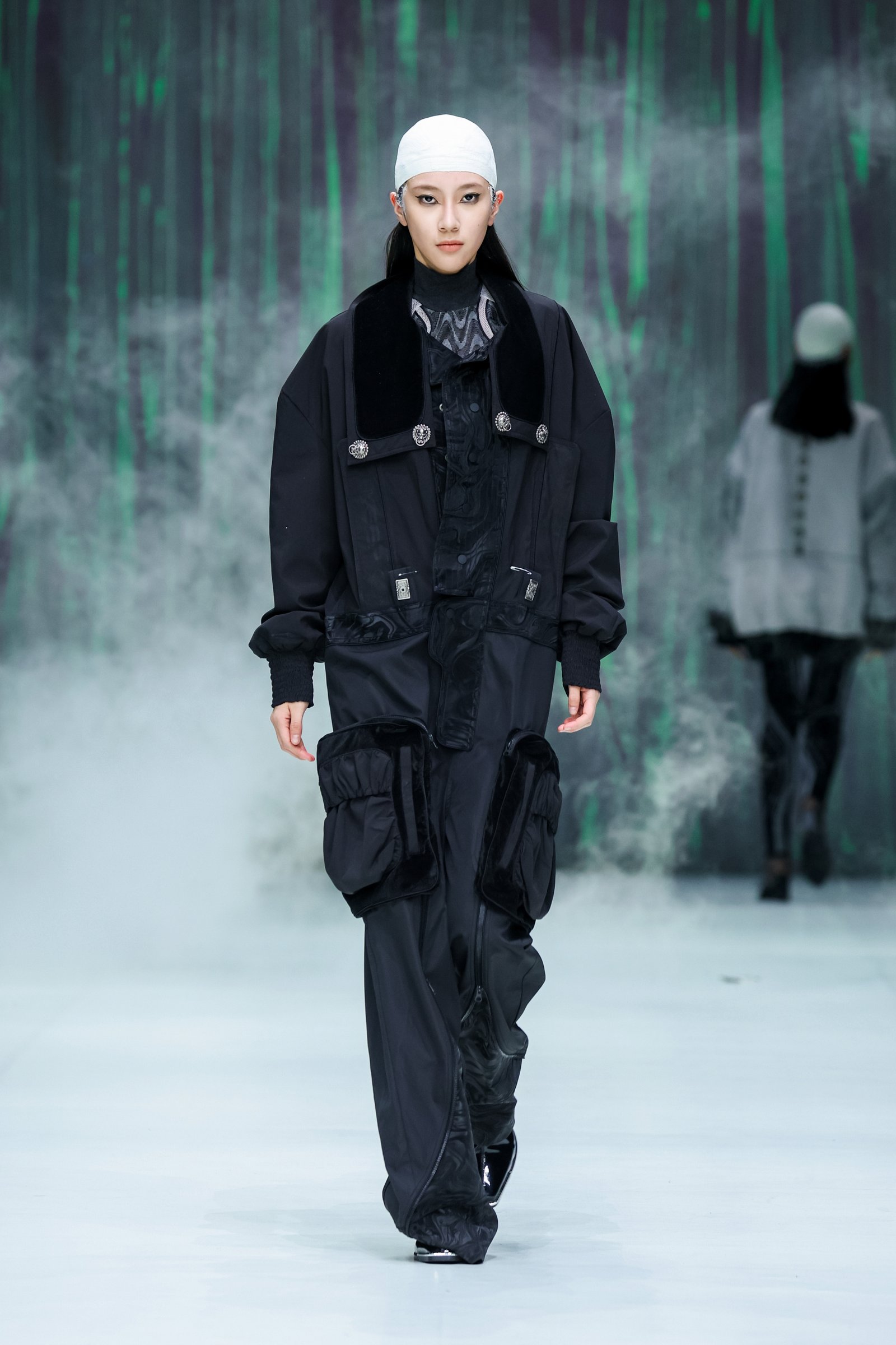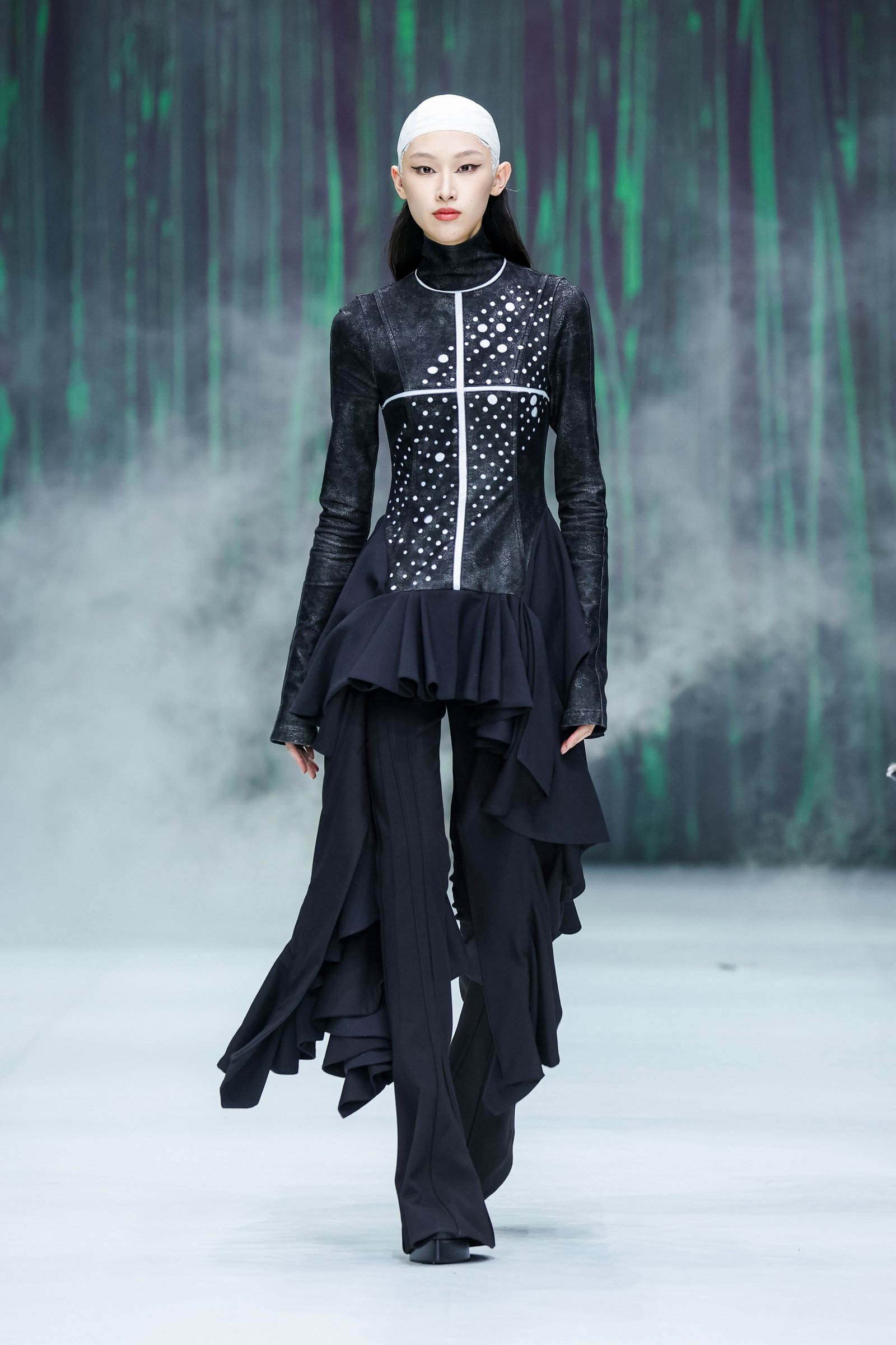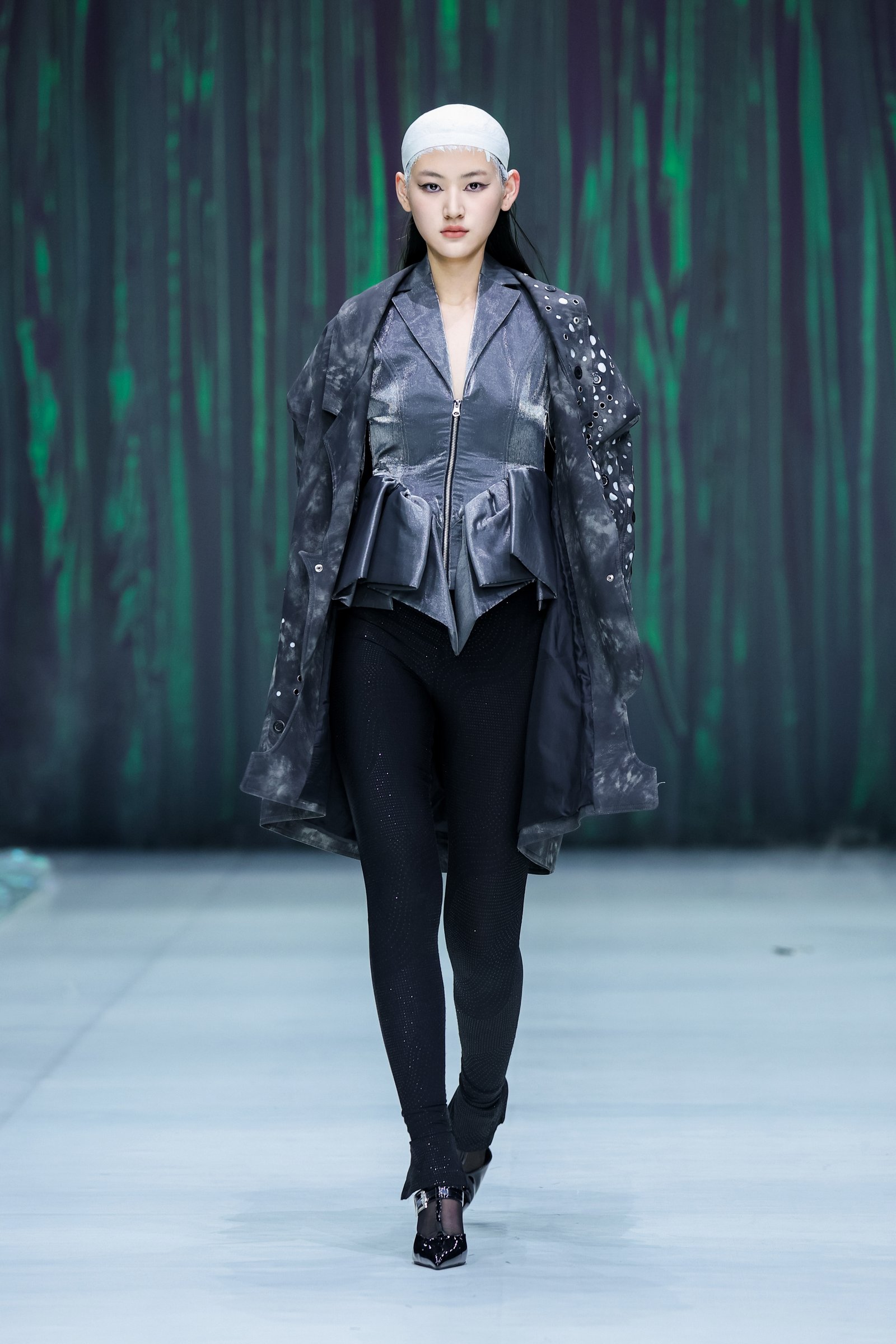 在本场发布秀中以曲线与机械结构的金属色彩交织为视觉母题的设计作品,将工业文明的精密感与生命体的律动感进行重组,既呼应了未来主义的冷峻,又暗合东方“天人合一”的哲学理念。