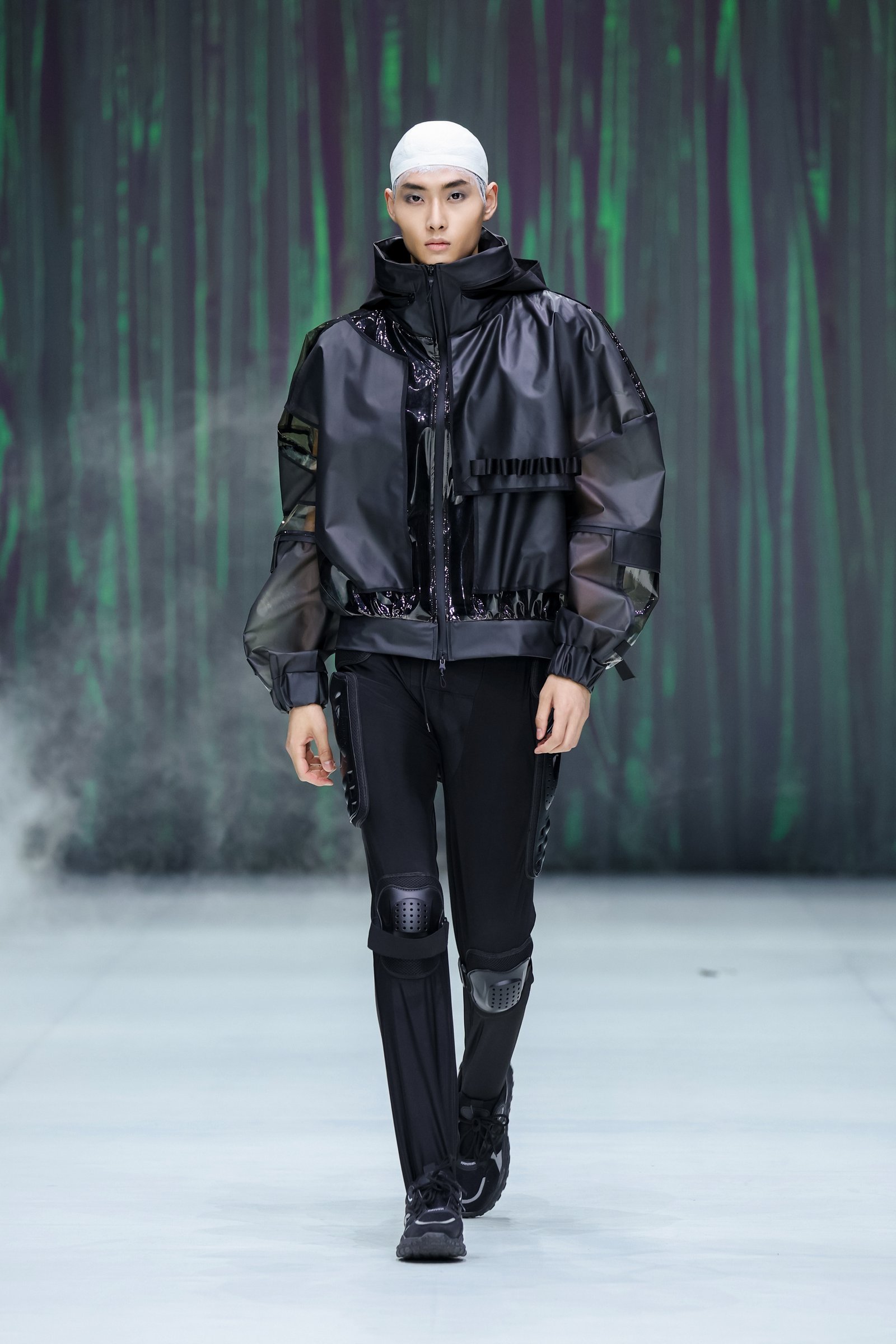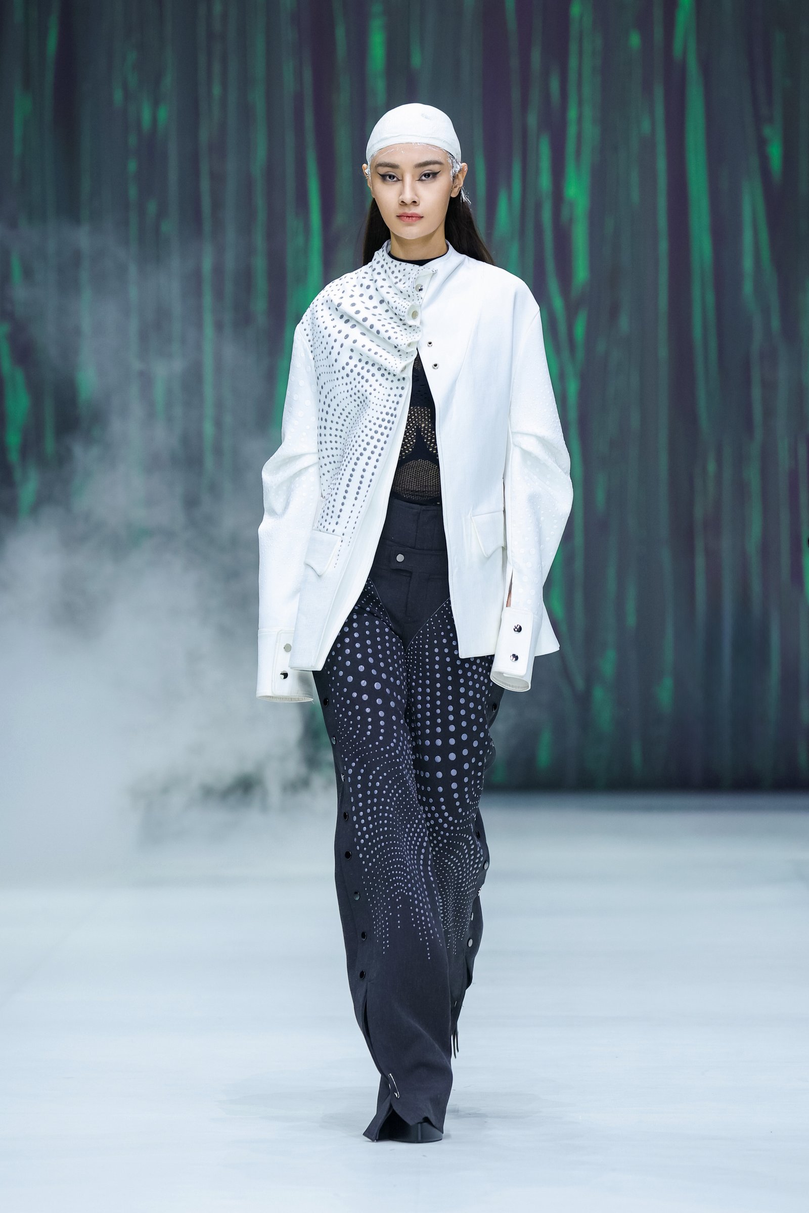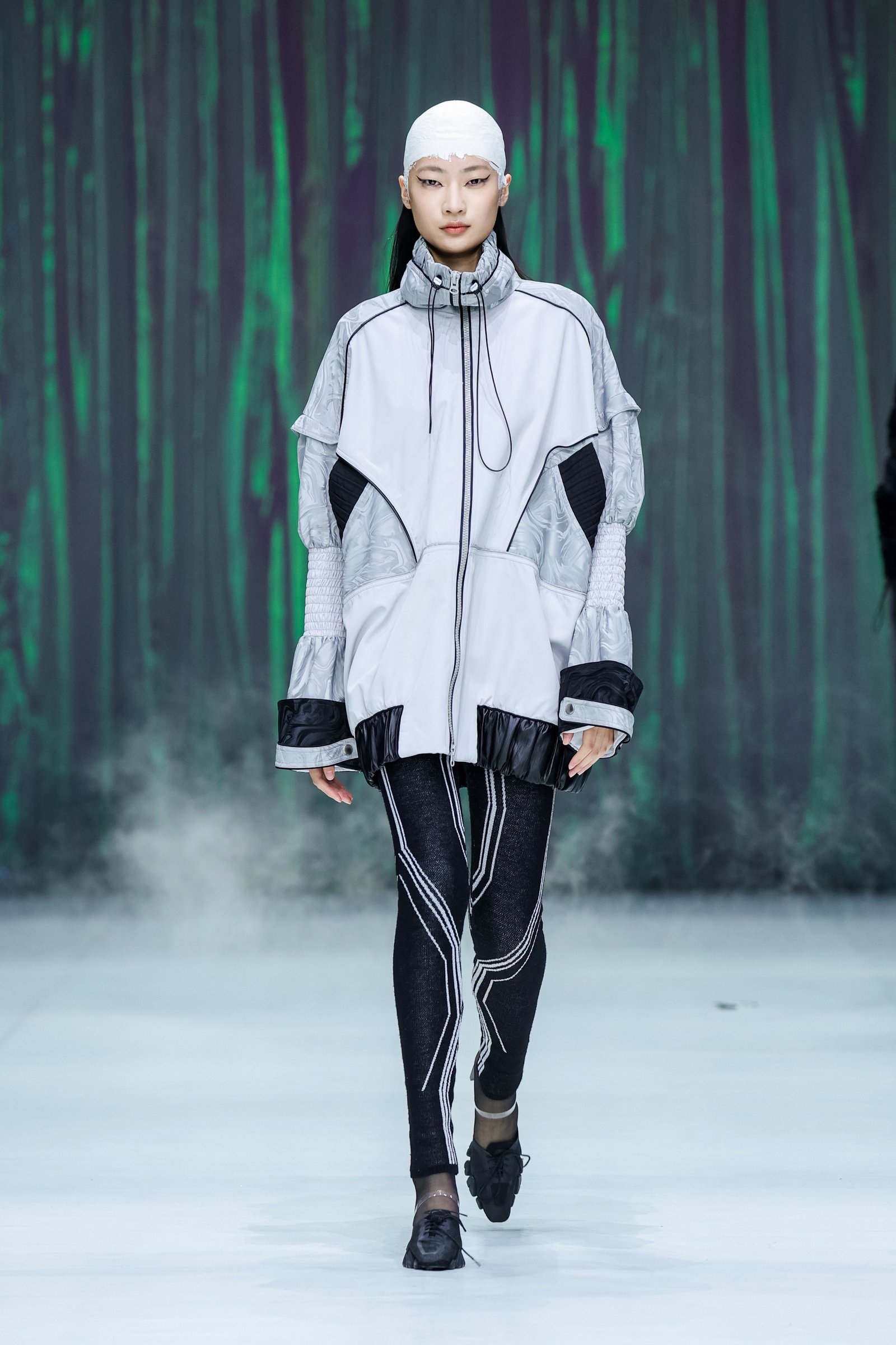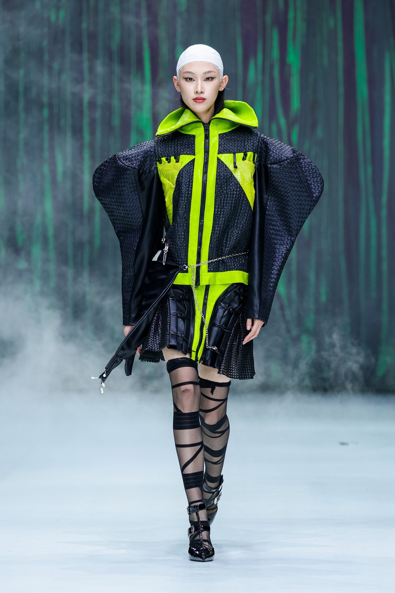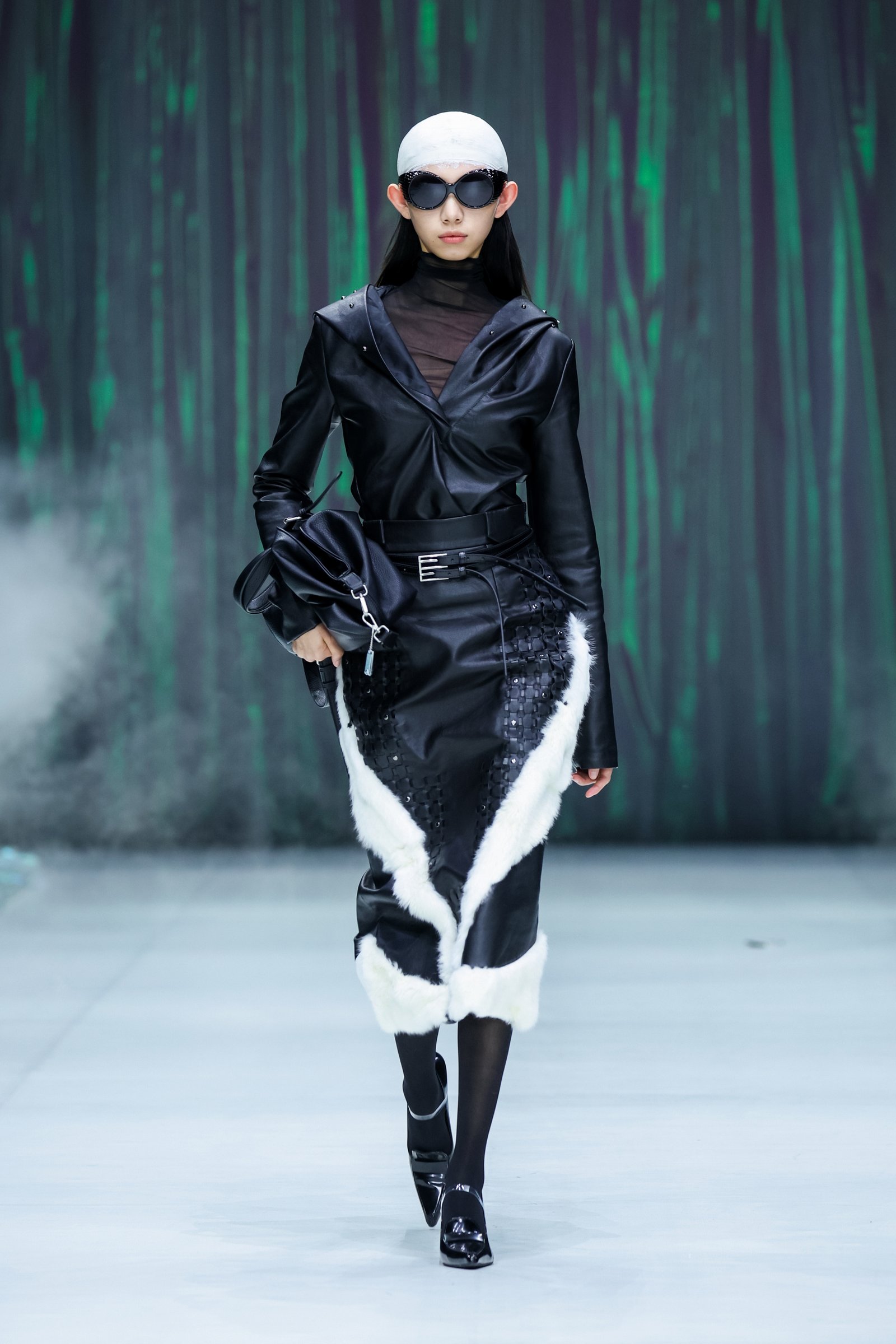 在本场发布秀中以曲线与机械结构的金属色彩交织为视觉母题的设计作品,将工业文明的精密感与生命体的律动感进行重组,既呼应了未来主义的冷峻,又暗合东方“天人合一”的哲学理念。