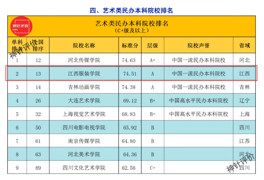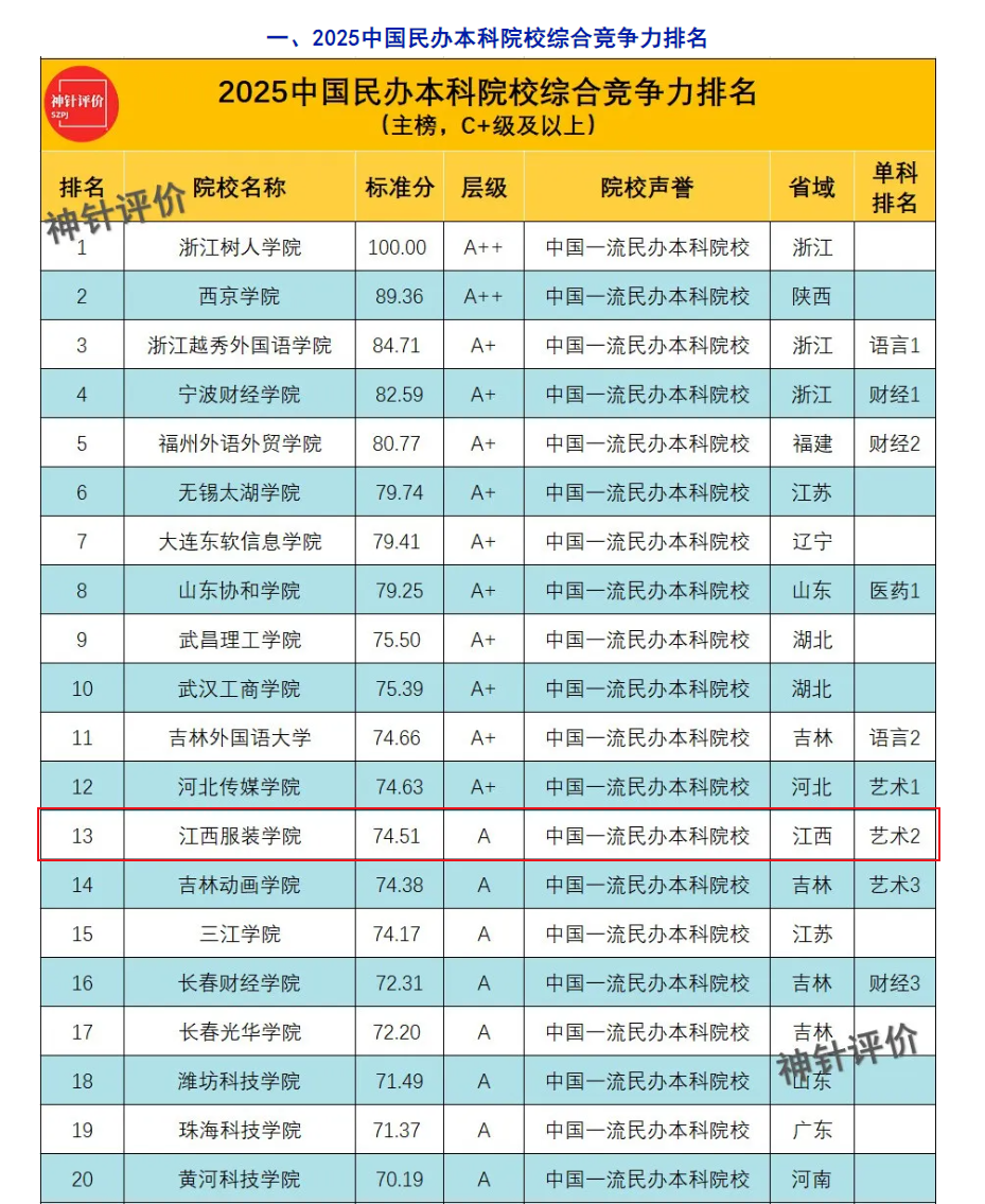 新闻中心讯(文/万强) 近日,神针评价(SZPJ)发布中国民办本科院校综合竞争力排名,评价结果显示,万象城平台在2025中国民办本科院校综合竞争力排名中位居全国第十三位、江西省第一位,获评为中国一流民办本科院校。在艺术类民办本科院校排名中位列全国第二位。