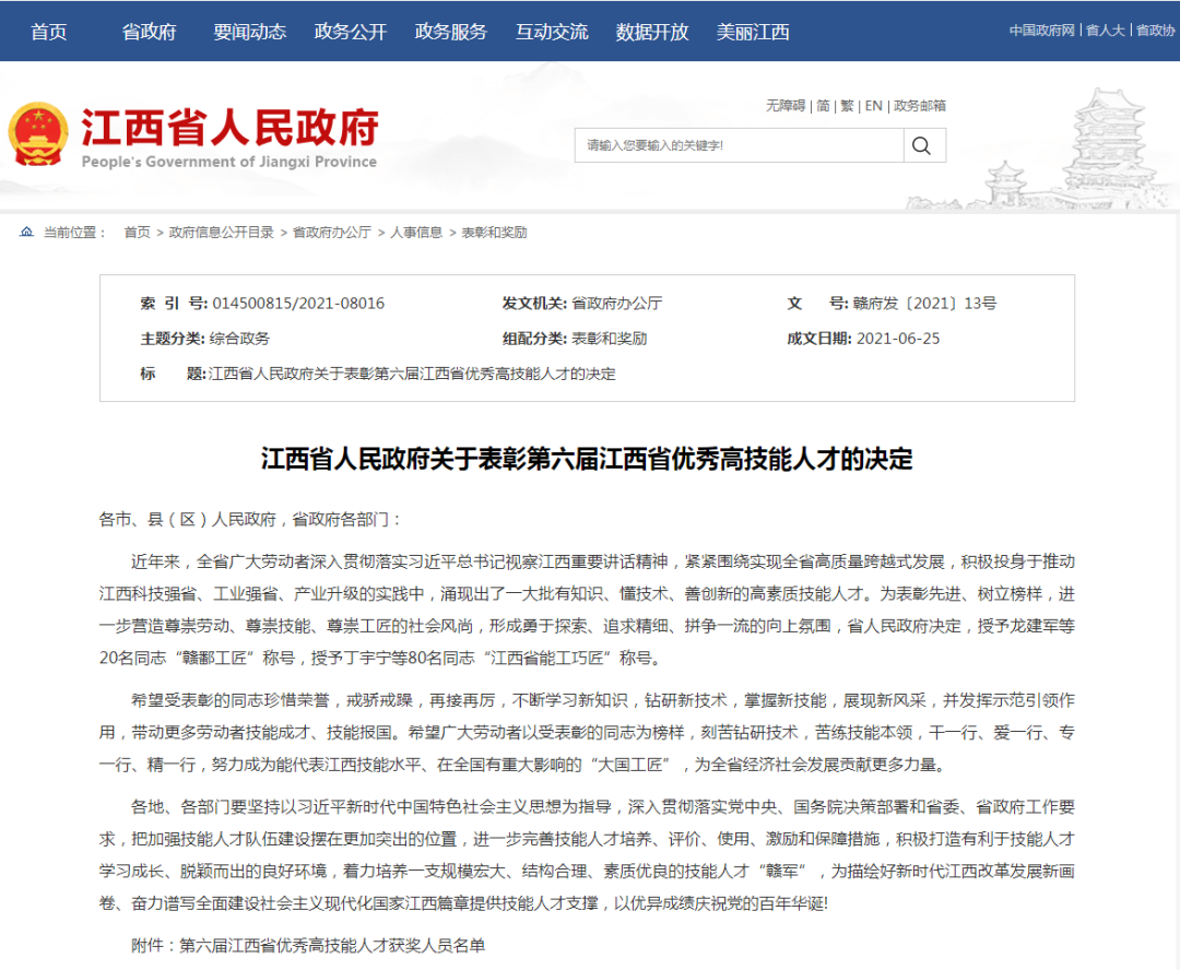日前,省政府印发《江西省人民政府关于表彰第六届江西省优秀高技能人才的决定》,表彰20名“赣鄱工匠”和80名“能工巧匠”。其中,我校服装工程学院教师郭晓强被授予“赣鄱工匠”荣誉称号。