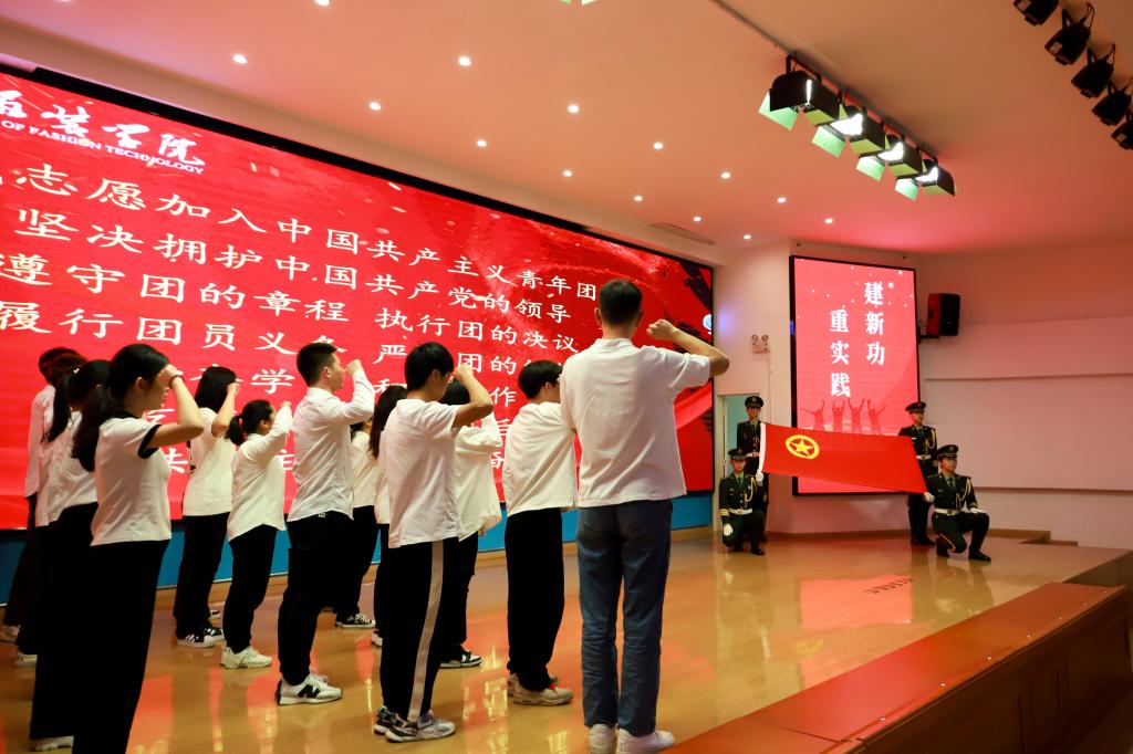 随后,校团委书记孟安然宣读新团员名单,老团员代表为新团员代表佩戴团徽,团委指导老师张震带领新团员面向鲜艳的团旗宣誓。