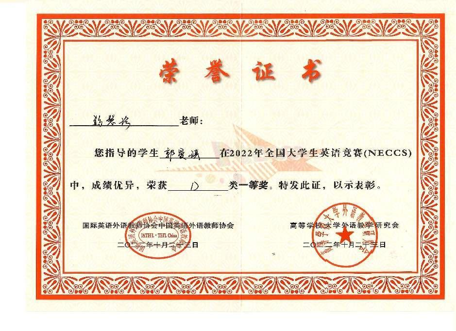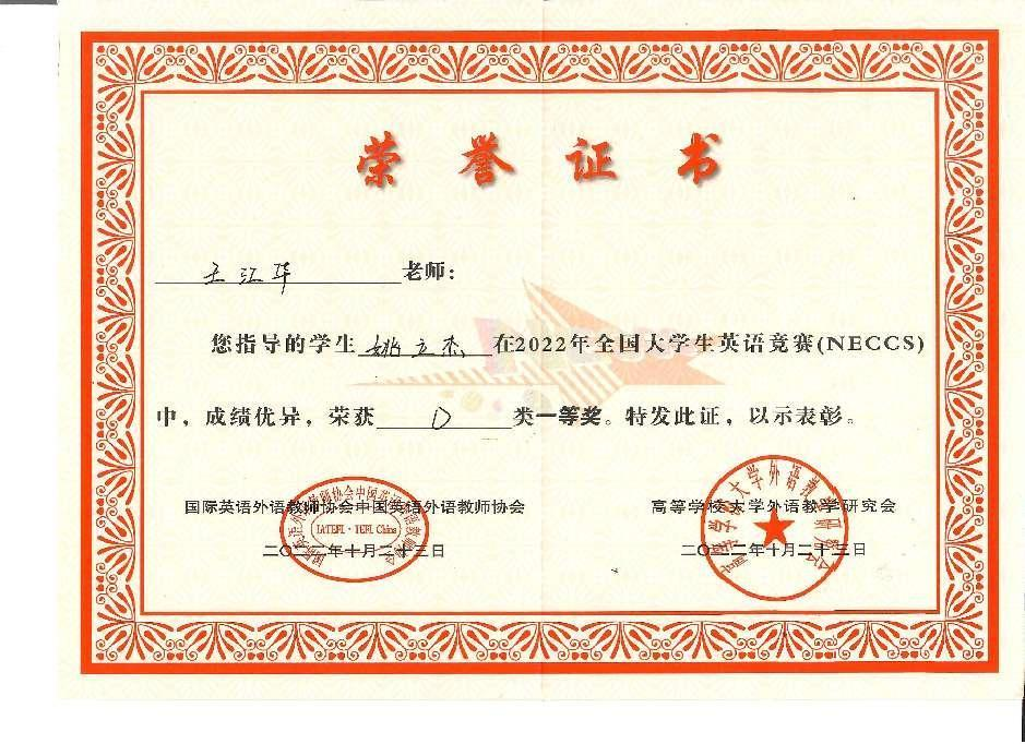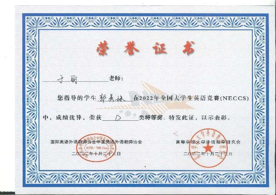 (新闻中心讯 供稿:人文学院 于丽)在近日公布的2022年全国大学生英语竞赛获奖名单中,我校人文学院吴丽娜老师荣获优秀组织奖;于丽老师指导学生荣获D类特等奖;王江华、罗蕾、彭慧珍老师指导学生分别荣获D类一等奖。