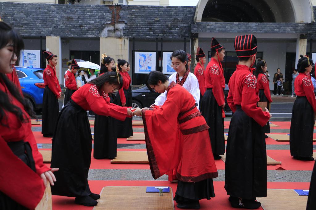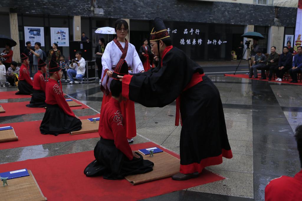 本届大学生集体成人礼,我校创新传统成人仪式。孔子学苑学员合奏古筝名曲《渔舟唱晚》,十名教师代表作为正宾为江服百名学子进行加冠加笄。“加冠加笄”“行醴礼”“冠者、笄者向父母、师长行礼”“取字、颁发成人证书”“宣读成人誓言”等仪式环节完成,寓意江服学子要树立成人意识,弘扬优秀传统,立志潜心向学,担当历史使命。