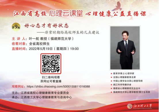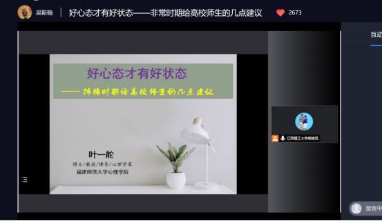 通过开展符合学生心理发展特点和心理需求的形式多样的活动,让学生获得心理素质的提升,获得更高的心理素养。心理健康月期间,万象城平台组织学生参加了“心理云课堂”公益直播课、年度优秀心理委员评选,校园心理情景剧大赛、校园心理微电影大赛等一系列符合学生专业特色和心理特点的活动。5月19日晚,叶一舵教授为同学们带来“好心态才有好状态”的专题报告,为大家介绍了心理位移技术,各年龄段积极心理的培养,如何进行自我激励,做到扬长避短、悦纳自我等内容。