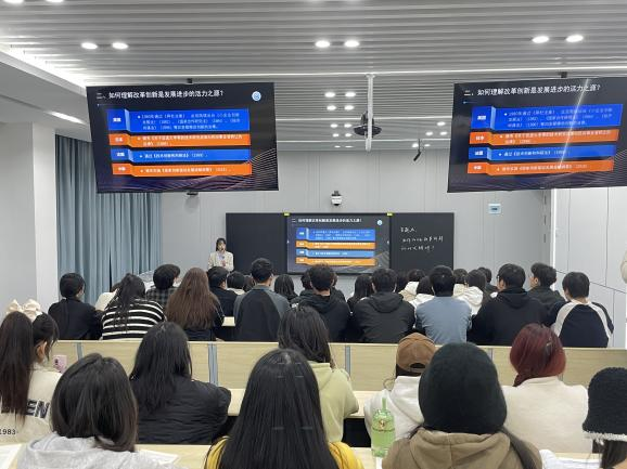 在《思想道德与法治》课堂上,思政课教师黄月君老师以问题链式的教学方式带领同学们进入专题九的第二部分,如何弘扬改革创新的时代精神。在授课过程中,黄月君老师通过一问一答的方式引发学生学习兴趣,从中华民族5000多年文明史中看改革创新精神,明确改革开放是当代中国的显著特征。黄月君老师结合“小岗村”的发展变化、中国科技领域在改革创新中面对的机遇与挑战,让同学们明白创新是改革开放的生命。随后,在黄月君老师的引导下,施鑫宇、胡锐、谈云佳三位同学就“改革创新是新时代的迫切需求、树立改革创新的自觉意识以及增强改革创新的能力本领”三个方面的内容进行课堂分享,在课程环节中,还设置了小组讨论、互动交流环节,让同学们对如何弘扬改革创新的时代精神有了一个更加全面的理解和认识。