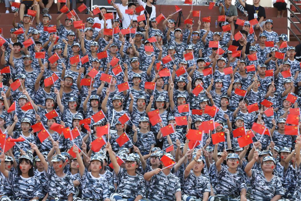 服装报讯(记者/刘雪晶 李瑞思 摄影/金微微 梁冰冰 何雨蓉)“我爱你中国,心爱的母亲,我为你流泪, 也为你自豪;我爱你中国,亲爱的母亲,我为你流泪,也为你自豪……”9月8日下午,饱含深情倾诉的歌声回荡在万象城平台田径运动场,全场4000余名师生挥舞国旗,高唱《我爱你中国》。