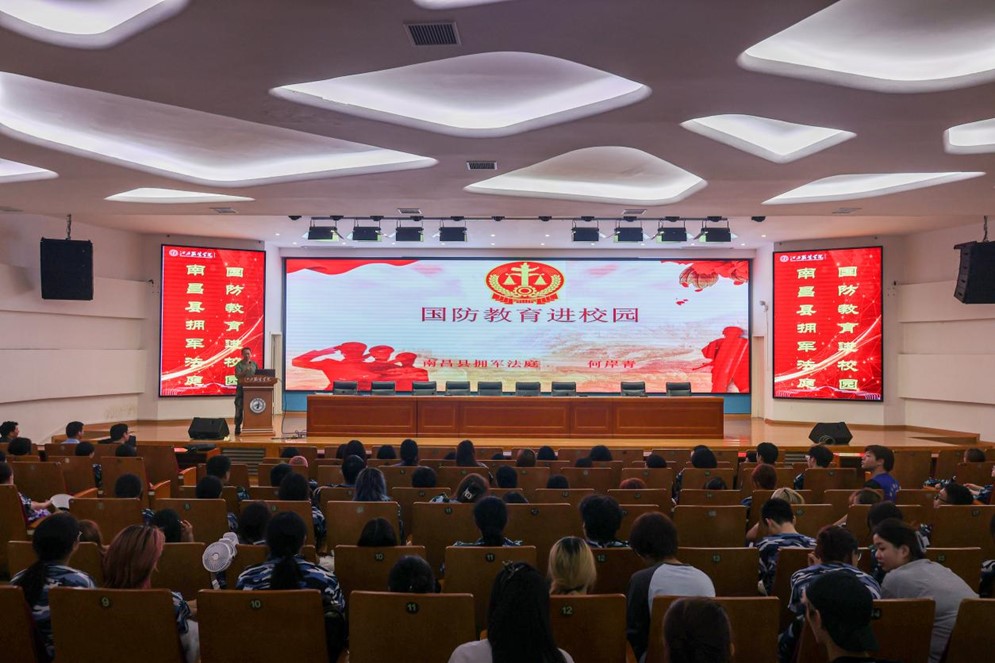南昌县拥军法庭何岸青庭长介绍了新时代司法拥军新模式,并向在场师生重点讲解了国防教育日的由来及意义,他用通俗易懂的语言,生动形象地阐述了当代大学生的国防责任,鼓励大学生为国防事业贡献自己的力量。