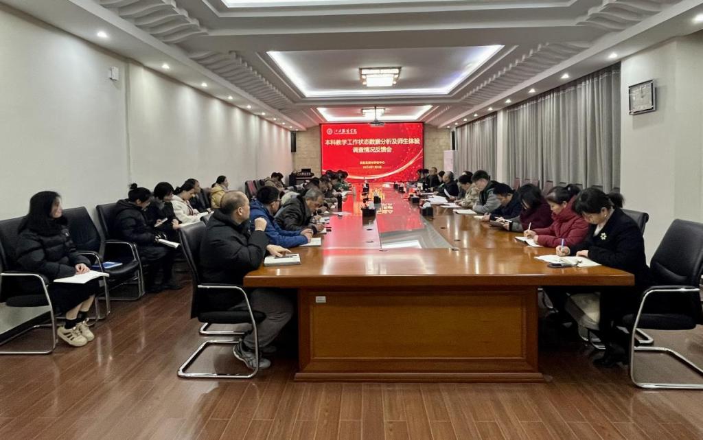 新闻中心讯(质评中心供稿)1 月8 日下午,我校在行政楼二楼会议室召开本科教学工作状态数据分析及师生体验调查情况反馈会。副校长刘孜杰出席会议,人事处、学生工作处、校团委、教务处、技产业处、资产处、就业处、创新创业学院、国际合作与交流处、网络与信息化管理中心和各学院(部) 相关负责人、教务处和质量监测与评估中心工作人员参加会议。