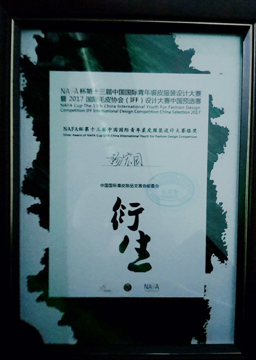 服装报讯(明海) 1月12日,我校服装管理分院2014级服装设计本科2班学生杨宏国凭借作品《夜色将晚》,在NAFA杯第十三届中国国际青年裘皮服装设计大赛暨2017国际毛皮协会(IFF)设计大赛中国预选赛中脱颖而出,获得大赛银奖。同时,杨宏国还将代表中国参加在意大利米兰举行的2017国际裘皮协会(IFF)设计大赛评选,并免费前往加拿大多伦多,在STUDIO NAFA进行为期一周的培训。我校获得第十三届中国国际青年裘皮服装设计大赛“育人奖”荣誉。