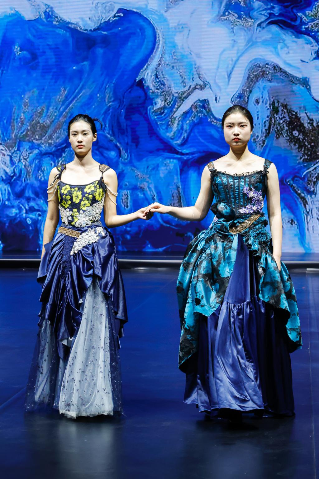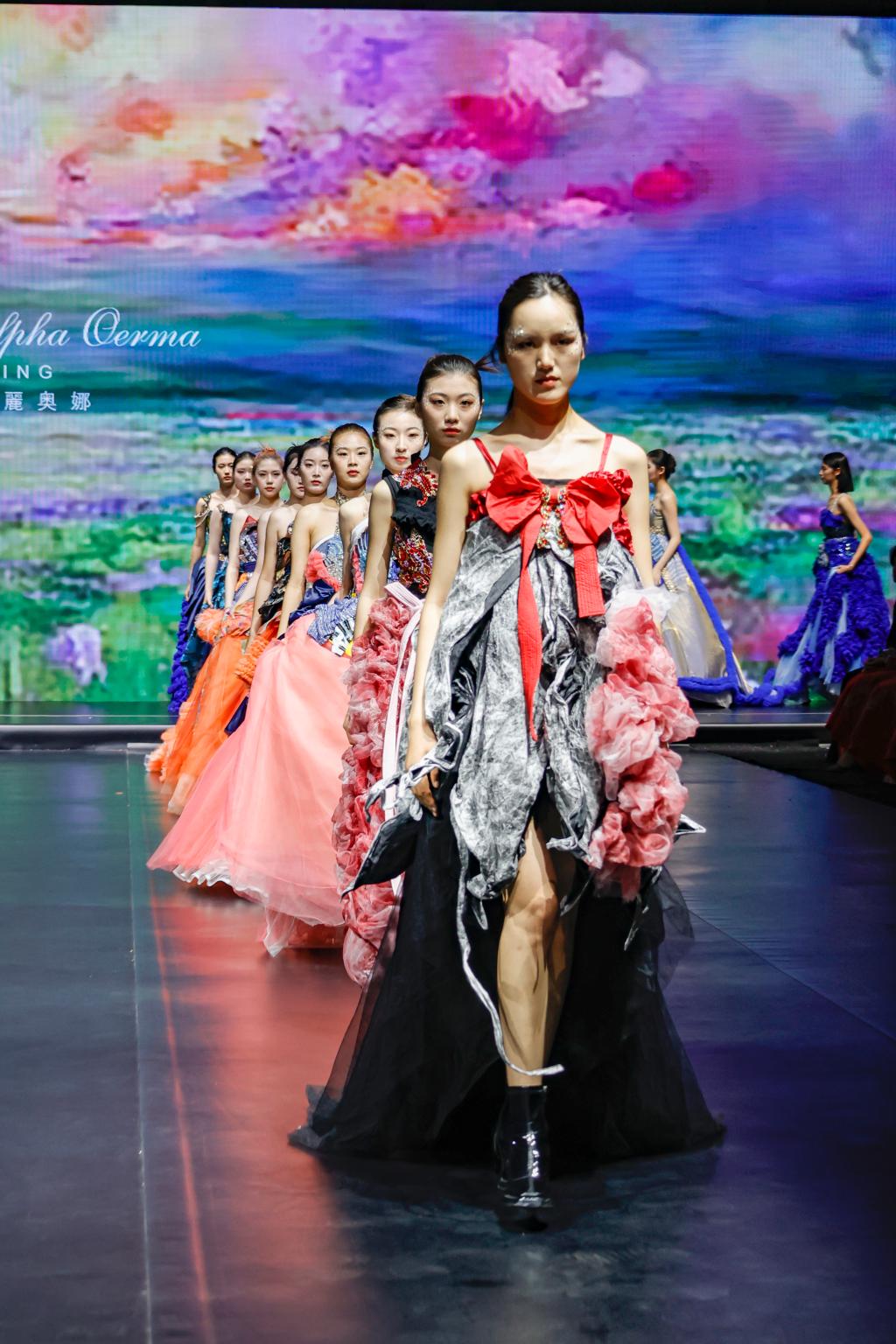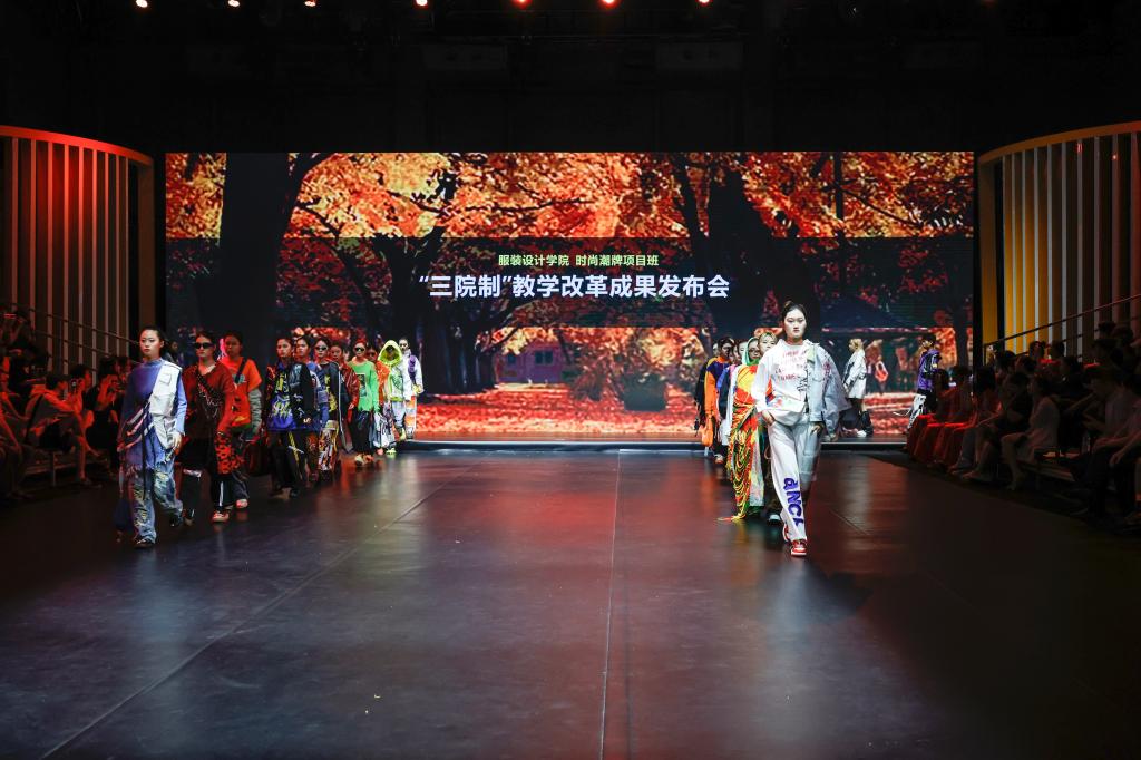 据悉,成果展以服装动态秀为主,辅以静态作品展示。此次产教融合项目教学成果展在400余名学生、20名企业导师的共同努力下,通过第一学期设计稿的绘制、纸样的确定,以及本学期成衣的制作,筛选出服装设计作品成衣约300余件及首饰、箱包、鞋子等产品参加教学成果展。本次参与成果展的项目有马克·蝶丽奥那婚纱礼服项目、赫利童装项目、卡私顿高定项目、三维潮牌项目、波司登(羽绒服)项目、新中装高定项目、武学伟&武学凯伯仲(羽绒服)项目、CHEN1988女装项目、品牌管理等项目。
