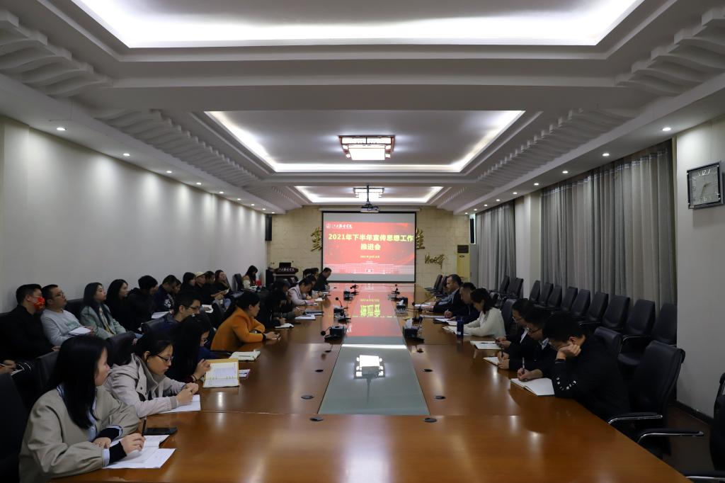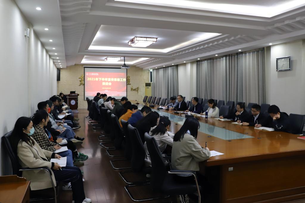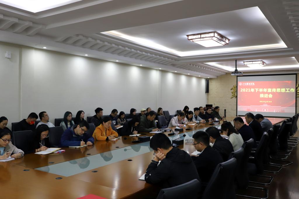 (新闻中心讯)为深入贯彻落实《关于进一步加强和改进新形势下高校宣传思想工作的意见》、《关于加强和改进高校宣传思想工作队伍建设的意见》文件要求,进一步加强我校宣传思想队伍建设,提升宣传工作水平,及时报道学校阶段性办学成果和学校改革发展中的重大决策,为校庆30周年营造浓厚热烈的氛围,10月19日,我校召开2021年下半年宣传思想工作推进会,校党委副书记唐新强主持会议并讲话,各学院党总支(副)书记、各相关部门负责人以及各单位新媒体运营负责老师参加会议。
