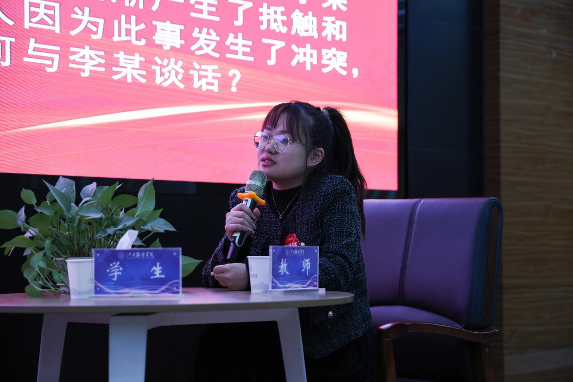 谈心谈话,主要考察辅导员对学生特征、学生成长成才规律的了解把握程度,对学生的教育引导能力、解决理论困惑和实际问题的能力等。参赛选手提前10分钟抽题,按照“人题匹配”的原则与学生开展谈心谈话。12位选手分别围绕情感困惑、学业压力、电信诈骗、党员发展、宿舍人际关系等话题与学生开展谈话,老师们充分运用心理学、教育学、职业发展教育等专业知识及自身工作经验进行价值引领,充分展示了辅导员扎实的政策把握能力、全面的信息分析能力与过硬的教育引导能力。比赛现场学生化身“戏精演员”,学生与老师金句频出,不时引出阵阵笑声,为比赛增添了欢乐性和趣味性。