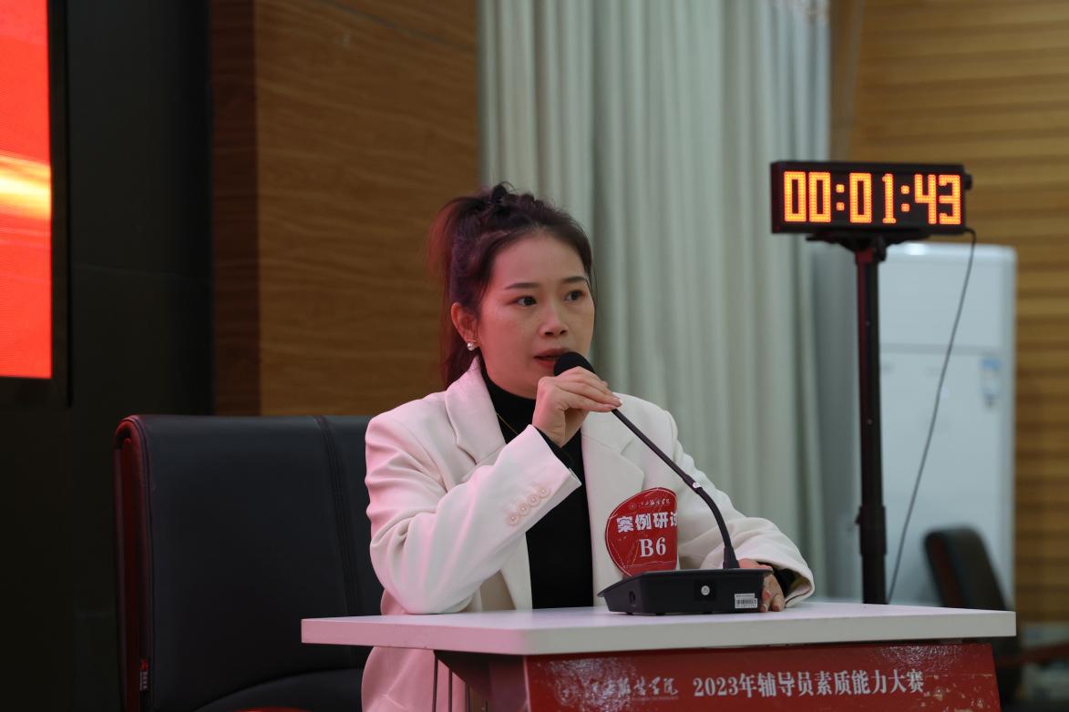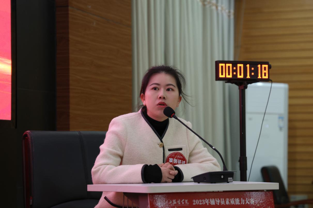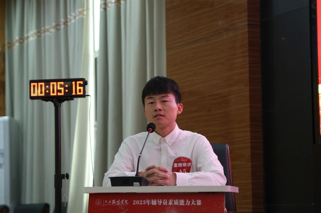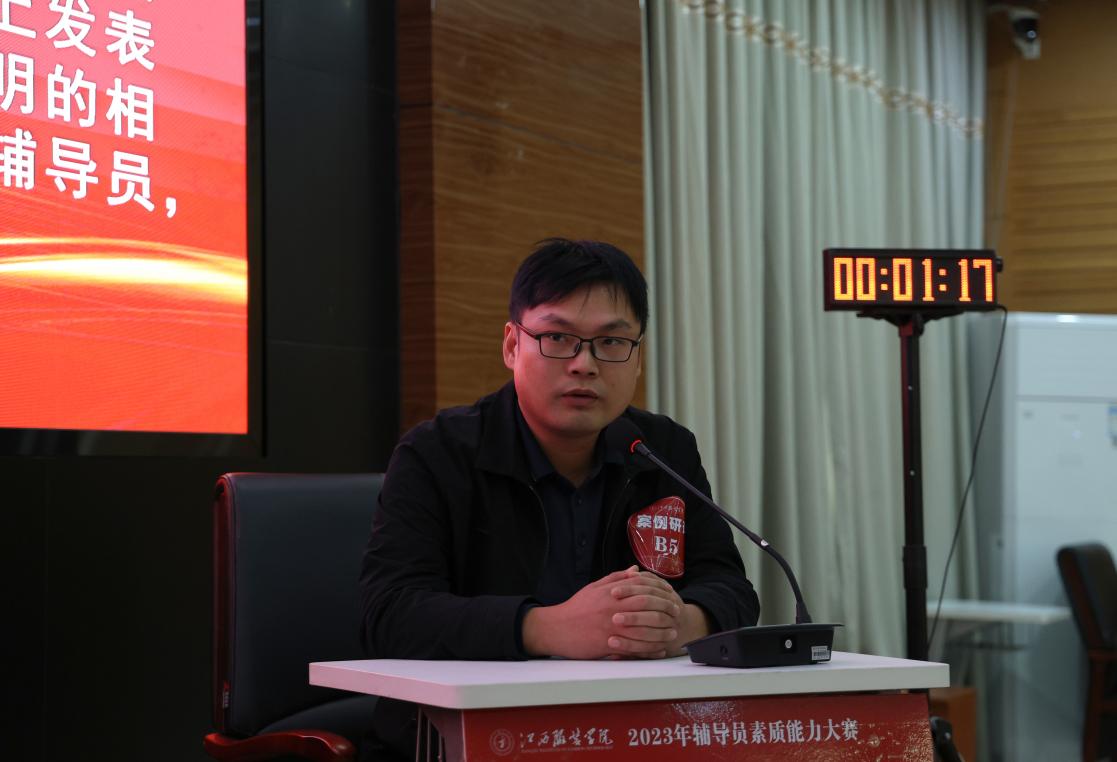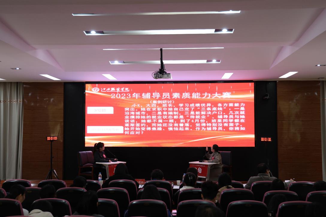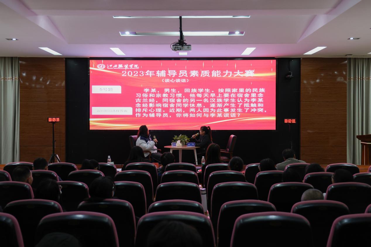 新闻中心讯(学工处供稿 摄影/钟涛 实习记者 陈谢晓庆) 为提升我校辅导员的理论水平、职业能力和专业素养,通过以赛促学、以赛促建,进一步推进我校辅导员队伍职业化、专业化、专家化发展,11月24日,我校举办2023年辅导员素质能力大赛初赛(基础知识测试),学校辅导员全员参与,通过“大练兵”全方位考核辅导员业务基本功,通过基础知识测试,共有12位选手进入决赛环节。25日,决赛(案例研讨、谈心谈话)在行政楼一楼报告厅顺利举行。第八届全国高校辅导员素质能力大赛一等奖、江西省高校辅导员素质能力大赛一等奖、江西省“十大最美辅导员”胡园慧;全国高校辅导员年度人物提名、江西省青年五四奖章获得者,江西省高校辅导员名师工作室主持人付妍妍担任评委。党委学生工作部部长邓良峰,各学院党委(总支)书记(副),全体辅导员及部分学生代表全程观摩比赛。决赛由艺术设计学院辅导员游丽君主持。