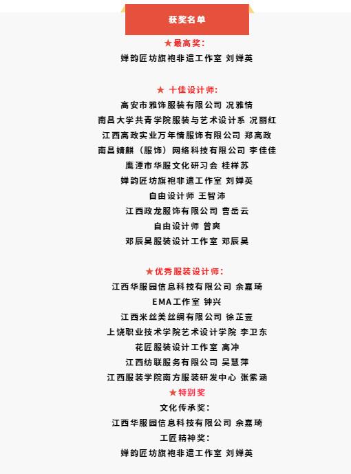 (新闻中心讯)12月18日,第二届江西省十佳设计师大赛决赛颁奖仪式在共青科教城体育馆举行。现场举行了江西省十佳服装设计师作品联合展演,颁发了2021江西省十佳服装设计师奖项、2021“鸭鸭直播大赛”奖项等。经过七位专家评委打分,评选产生“最高奖、优秀服装设计师、十佳设计师、特别奖”四个奖项。我校教师刘婵英、王智沛获得十佳设计师奖;刘婵英老师同时斩获大赛最高奖、特别奖·工匠精神奖等至高荣誉。