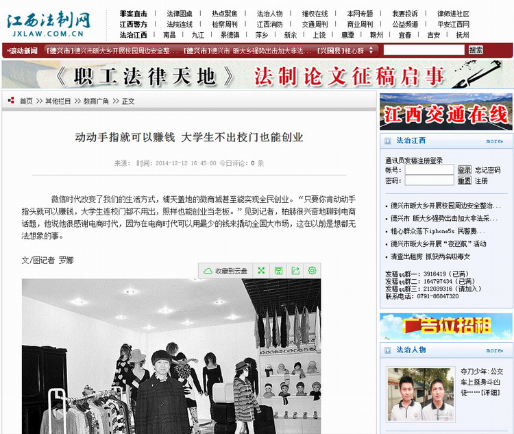 链接:新法制报报道 《动动手指就可以赚钱 大学生不出校门也能创业》