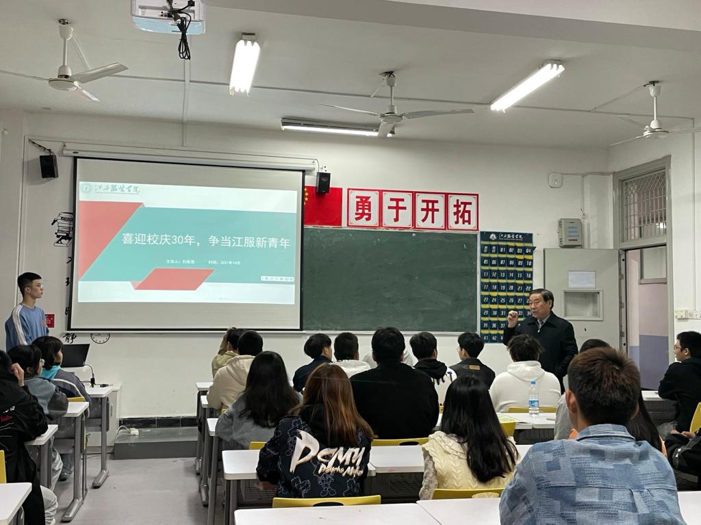 (新闻中心讯)为迎接建校30周年,加深同学们对校史、校情、校训的了解,激发全体同学对学校的归属感、认同感和自豪感,切实强化学生爱校荣校意识。10月24日晚,我校412个班级共同开展“喜迎校庆30年,争当江服新青年”主题班会活动,主题班会从观看“时尚新征程,聚力再出发”校庆30周年宣传片,校史校情解读,宣读“庆三十华诞 展江服风采”校庆倡议书及唱颂校歌《书写华章,织就辉煌》等四部分展开。