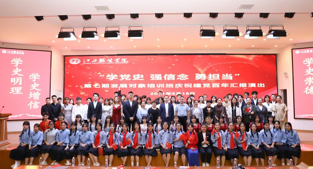 本期培训在丰富教学内容,创新教学形式方面,主要采取:一是线下专题学。围绕学习党史设置了9个专题讲座,1堂微党课,内容主要包括百年党史、改革开放史、四个自信、坚定理想信念、党章、党性修养、党员科学家的先进事迹等,其中校党委书记陈付龙、2位党委副书记唐新强、李宝君等党委主要领导亲自上专题党课。通过老师们形象生动、深入浅出的阐述,使大家对党史党章党规有了较全面的了解;二是线上观看学。集中观看《红军长征在路上》、《建党伟业》、《古田1929》等红色主题电影、纪录片,回顾重要历史事件,感受百年党史;三是红色实践学。赴方志敏烈士陵园凭吊烈士,学习革命前辈的崇高信仰;参观南昌八一起义纪念馆,学习“八一”精神;四是分享交流学。围绕“谈谈对中国共产党的认识”,每个学员撰写1000字的学习体会,部分学员用PPT展示形式分享了自己对中国共产党的认识,进行思想碰撞,激发浓厚的爱党情;五是平时考核督促学。制定考核办法,注重理论考核与平时考核相结合。总成绩100分,结业考试成绩占60%,平时考核占40%。其中平时成绩包括出勤、笔记、讨论和参加活动,以此督促学习;六是考试检验学。党委党校统一组织考试,检验学员学习效果;七是举办比赛学。开展“百年征程波澜壮阔,百年初心历久弥坚”庆祝建党100周年知识竞赛,7个学院学生党支部组成的7支参赛队伍,28名选手参加,其余学员现场观摩,共同学习;八是转化成果学。根据艺术专业学生较多的优势,每星期录制2期音频,传递“党建好声音”,内容包括红色家书、人物故事、经典文章、语录等;举办一场“学党史、强信念、勇担当”学习成果汇报演出,将学习成果通过舞台表演艺术展现,实现学习成果的深华。