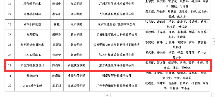 新闻中心(教务处顾金波撰稿)近日,江西省教育厅公示了首批江西省校企合作一流本科课程拟立项建设名单。我校陈晓玲老师的《3D数字化服装设计》一门课程入选首批江西省校企合作一流本科课程立项建设名单。