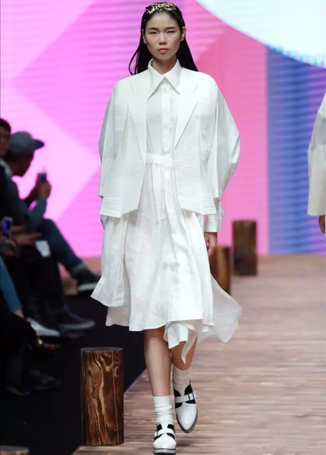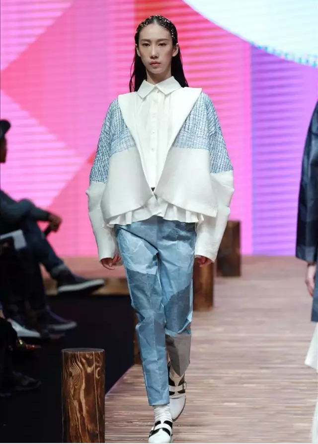 付志臣的作品《纯形态的境界》,色彩清淡,设计简单实用。而且他很取巧的将局部放大,比如领子,袖子,脚口等。制造一种蓬松感,自由感。通过服装多层次搭配,有轻有重的配色方案,一下就获得评委们的青睐。