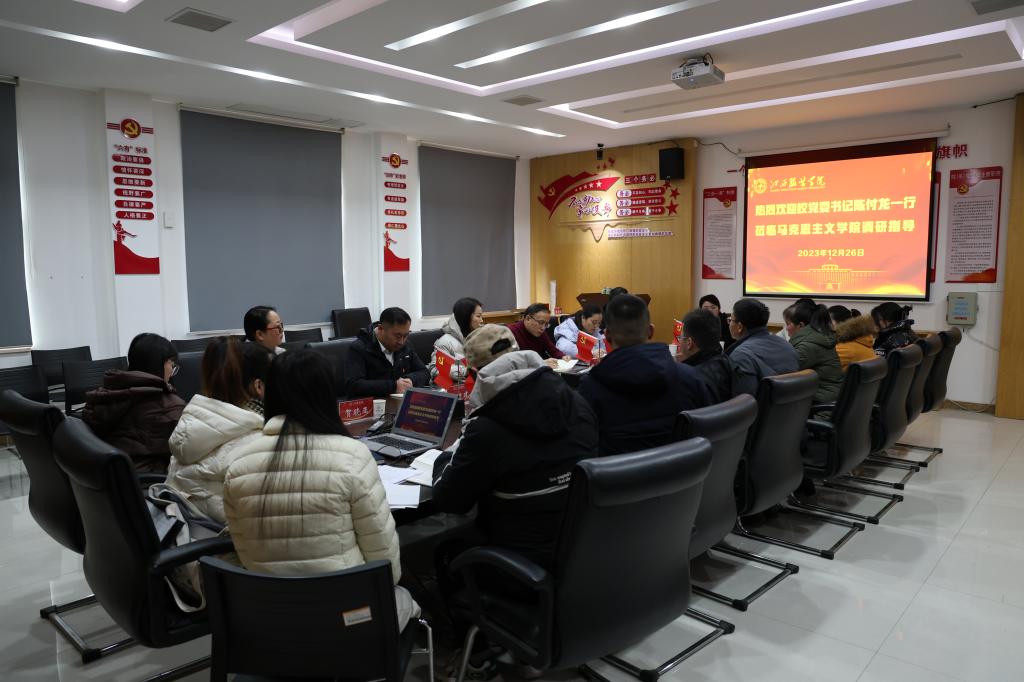 新闻中心讯(马克思主义学院供稿)为深入了解我校思政课建设和思政课教师队伍建设情况,进一步加强新时代马克思主义学院建设,2023年12月26日下午,省督导专员、校党委书记陈付龙一行赴马克思主义学院调研指导,学校党政办、组织部、宣传部、人事处、财务处、教务处、科技产业处职能部门负责人陪同调研。马克思主义学院党政领导班子成员及教师代表参加会议。