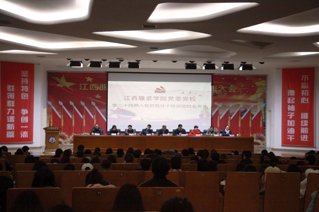 服装报讯(记者/黄海蓉 实习记者/刘莹莹 摄影/张蔷薇 林立锋 刘贡献) 12月28日晚,校党委党校举行了第二十四期入党积极分子培训班结业典礼。校党委副书记、党校校长高建国,党委委员、党委组织部部长陈翠娥,党委委员、学工部部长张建荣及校团委书记、各学院党总支书记出席典礼,各学院学生党支部书记、组织委员及全体培训学员参加了典礼。典礼由党委委员、党委宣传部部长彭波主持。