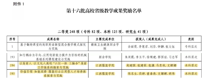 服装报讯(宣宣)近日,教育厅发布“关于第十六批高校省级教学成果奖励名单的公示”,我校由陈东生、段婷、董春燕、支娜娜、胡伟申报的“价值引领 知能双修 服装行业应用型人才培养体系探索与实践”,由高建国、张建荣、张潇、马忠秋、支娜娜申报的“以美育人 以文化人高校“六位一体 三融合”美育工作体系的探索与实践”2个项目获教学成果奖二等奖。