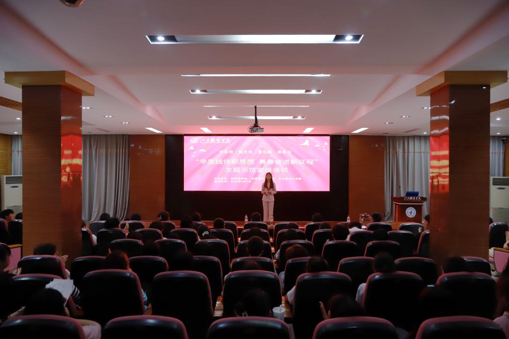 新闻中心讯(记者/韩志慧 实习记者/何凌 唐瑶 摄影/张健城 邹师娟)为深入学习贯彻宣传党的二十大精神,推动学习贯彻习近平新时代中国特色社会主义思想主题教育走深、走实、取得实效。6月7日晚,由党委宣传部、党委学生工作部、马克思主义学院联合举办的“学思践悟新思想,青春奋进新征程”主题示范宣讲活动在行政楼一楼报告厅开展。校学工处副处长侯娜娜、党委宣传部副部长朱雨春、马克思主义学院党总支副书记陈洋安、党委宣传部龙瑞行老师出席了本次活动。“一站式”学生社区服务中心、大学生宣讲团的同学们参加了本次活动,本次活动由韩梦茹同学主持。