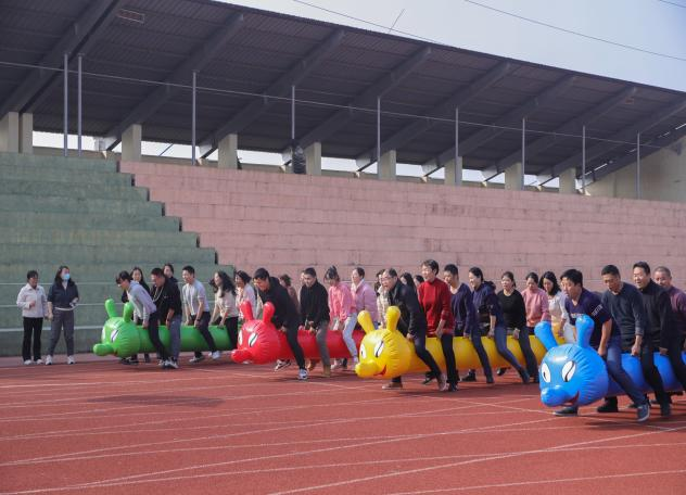 其后,以各分工会为单位,在田径运动场举行了趣味运动会。包括骑在毛毛虫到终点、鼓面平衡球、多人多足等。活动中,大家齐心协力、互相鼓励、默契配合,展现了各分工会团结奋进的风采。