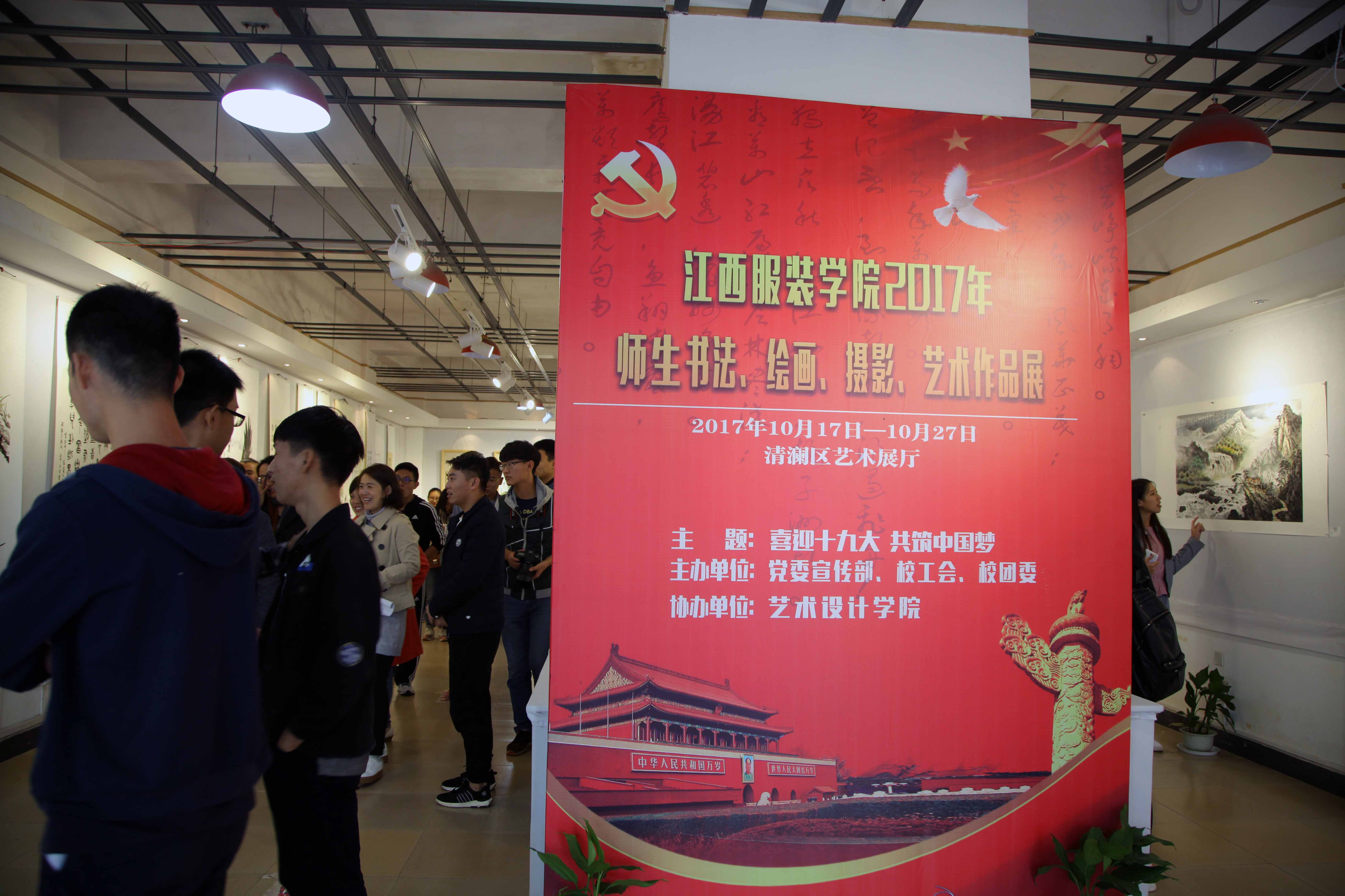 服装报讯:为喜迎党的十九大胜利召开,展示我校师生艺术风采,陶冶艺术情操,10月17日——27日,“喜迎十九大·共筑中国梦”主题师生艺术作品展在艺术设计学院展览厅开展。 此次艺术作品展题材丰富,不仅有气势磅礴的山水画,还有惟妙惟肖的花鸟人物画;不仅有笔走龙蛇的书法作品,还有构图精美的摄影作品;不仅有时尚前卫的时装画,也有匠心独运的工艺美术设计作品。作者既有学生也有老师,既有专业,也有业余。大家以饱满的热情,用不同的艺术语言歌颂了伟大的党、伟大的祖国,反映了改革开放的伟大成就,抒发了广大师生的自豪感和喜庆心情。“翰墨洒真情,颂歌献给党。”参展的艺术作品充分体现了江服师生的艺术才华,也为参观者提供了一场视觉盛宴。 日前,一系列“喜迎十九大”、“向十九大献礼”的活动正在我校有声有色地开展,形式多样、丰富多彩的文体活动吸引了师生的广泛参与,增强了师生对党领导建设取得巨大成就的认识,加深了对党的感情。广大师生把迎接十九大与日常工作学习相结合,展现江服师生激昂向上的风貌,通过实际行动向党的十九大献礼!
