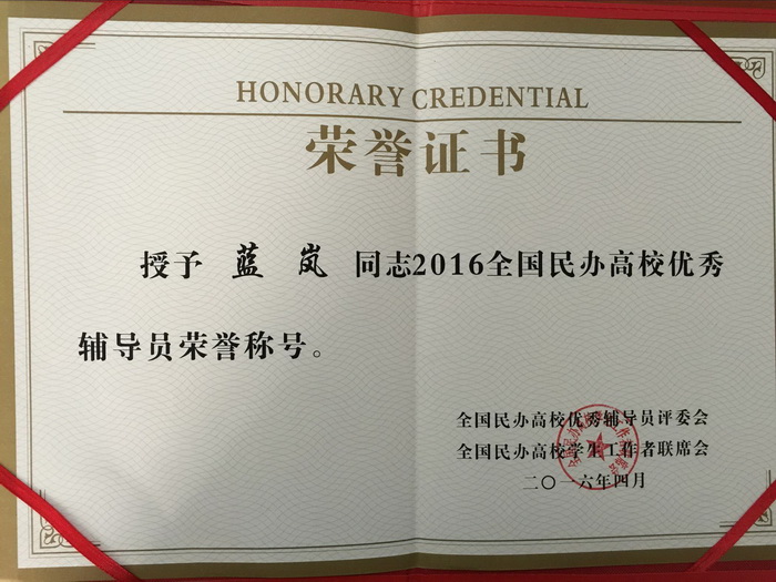 “全国民办高校优秀辅导员”,是全国民办高校辅导员队伍建设的最高荣誉,由全国民办高校学生工作者联席会组织评选。此次共评选出优秀辅导员100人。蓝岚主任从众多竞争者中脱颖而出,充分展示了我校辅导员精神风貌和能力素质,是我校辅导员队伍建设取得的新成效。