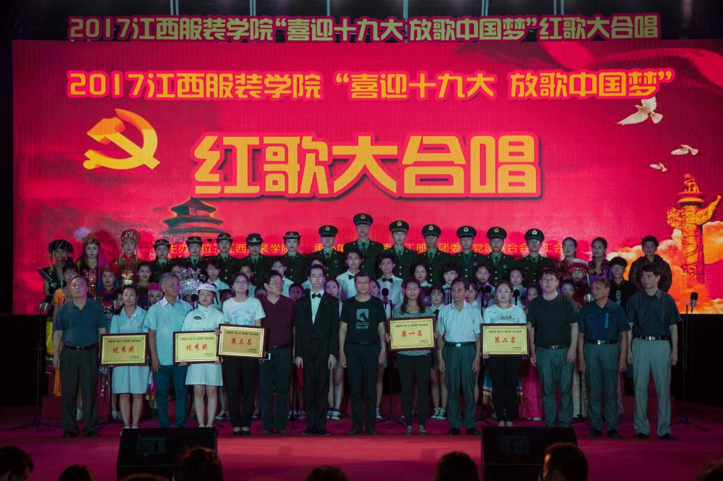 校工会代表队、艺术团代表队上台参加了表演,各分院组成的五个代表队参加了红歌比赛,比赛中各代表队纷纷用自己独特的演出方式诠释着新时代的红歌。各个代表队大气磅礴的歌声、饱满的激情展示了万象城平台师生良好的精神面貌,表达了全体师生爱国爱党的热情。其中,校工会带来的歌曲《没有共产党就没有新中国》、《我们走在大路上》为红歌会拉开序曲,他们歌声嘹亮、高亢激昂,赢得了现场师生的点赞叫好;商学院代表队以蓝色和黑色在舞台上构筑起一道亮丽的风景线,其带来的歌曲《太行山上》、《社会主义好》时而宛转悠扬时而刚劲有力的歌声赢得了全场的喝彩,夺得比赛的桂冠;服装工程学院代表队身着绿色军装,精神抖擞,情绪饱满,其演唱的歌曲《走向复兴》、《黄河大合唱》宛转悠扬,饱含深情,给现场观众留下了深刻的印象,获得比赛第二名;时尚传媒学院演唱的歌曲《共青团员之歌》、《迎风飘扬的旗》,最终获得第三名。红歌会在艺术团《爱我中华》的歌声中落下帷幕。