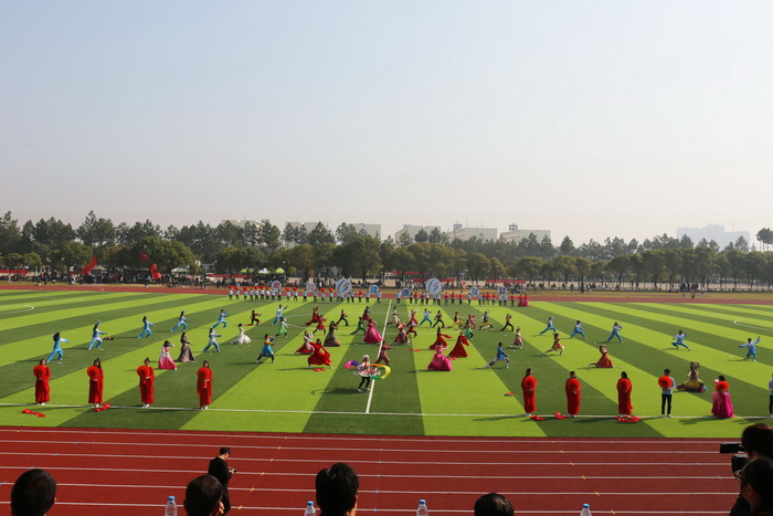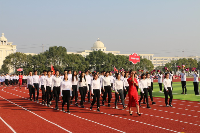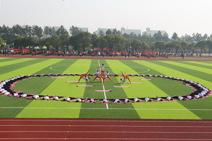 在运动员代表、裁判员代表分别宣誓后,进行了大型文体表演。首先是校团委社团联合会同学献唱的《光荣与梦想》,伴着豪迈的歌声,地面彩旗飞扬,空中无人机飞翔;接着出场的是体育教研室老师、同学将瑜伽、探戈等合组编排的充满艺术美的《嗨 party》;随后由校团委朱红书记领军的260名指导老师、同学统一穿着红色T恤,在《撸起袖子加油干》的歌声中,跳起了充满信心、充满活力的健身操;随后工程学院由170人组成的军体拳方队表演了《武动青春,扬我军魂》,同学们整齐有力的表演,充分展示了军训成果和团队精神;商学院的青春活力操《goodtime》,伴随动人的旋律,优美的舞姿,律动的身影,彰显着年轻大学生积极向上、充满活力的朝气;艺术学院320名同学组成四个方队进行了花样队列表演,依次组合变换了“2017”“十九大”“艺”等关键词和党徽图案,表达了江服师生紧密团结在习近平同志为核心的党中央周围,不忘初心牢记使命,用十九大的精神激励自己在今后的工作和学习中,将青年的责任与学校的发展紧密结合起来,实现个人的最大价值,为实现中华民族伟大复兴的中国梦不懈努力;设计学院学子们的花样跳绳表演,绳舞飞扬,舞出了青春,舞出了活力,更舞出了设计学院勤学、健康发展的庄严和豪迈;传媒学院的啦啦操,通过运动员完成高超的特殊动作技巧并结合各种舞蹈动作,集体展现青春活力、健康向上的团队精神的运动。最后是各表演团队一起登场呈现的花样歌舞《同一个世界同一个梦想》谢幕表演,色彩缤纷,大气磅薄,神采飞扬,展现出对美好生活的赞美,对美好未来的向往。整场文体表演精彩纷呈,为开幕式画上了圆满的句号。经过评委评选,时尚传媒学院表演的啦啦操荣获表演项目一等奖,其他单位各有斩获。