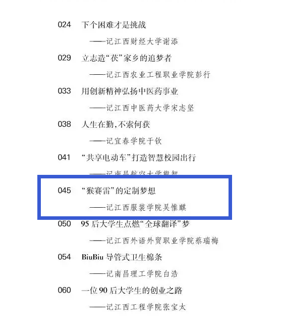 编者按:为进一步引导全社会共同关心和支持就业创业工作,引导高校毕业生树立正确的就业观、创业观,营造良好社会氛围,2017年,江西省高等院校毕业生就业工作办公室面向全省高校开展了“奋斗·青春”——大学生创新创业人物事迹征集活动。经过学校推荐,专家严格评审,遴选出30名创新创业典型人物汇编成《闪亮的青春》丛书。我校商学院吴惟麒同学成功入选“奋斗·青春大学创新创业人物事迹活动” 的典型事迹。