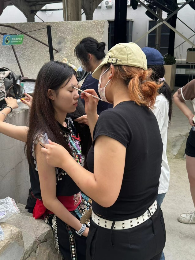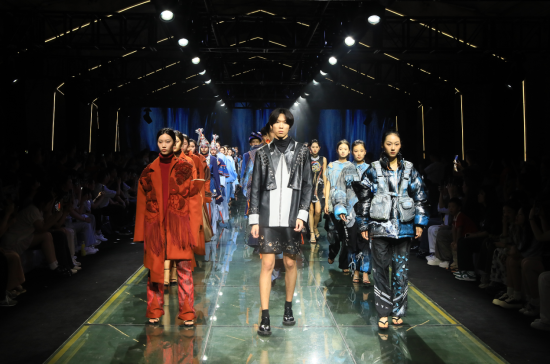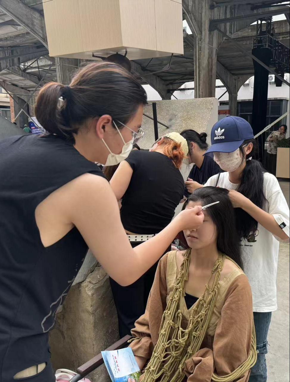 展演的作品不仅具有创新性还有实用性,有的采用了纺织新材料或面料再造,有些与少数民族与非遗传统文化相融合,创意灵感奇思妙想,展品丰富多彩,八十多套作品参加开幕式秀场展演。在化妆造型中,化妆团队结合本学期熊怡裴老师《发型与毛发制作》课程所学知识,设计符合此次走秀的妆面及发型,并完成梳发及妆面塑造,为演出增光添彩。在编排中,编导团队结合本学期杨启航、刘君亮老师《服装表演编导实践》课程中所学知识,将课堂中所学知识与实践活动相结合,将展演作品分为传统服装与现代服装两个篇章,结合音乐、灯光、素材营造出一场高质量的展演活动,吸引众多游客纷纷驻足观看并鼓掌点赞。