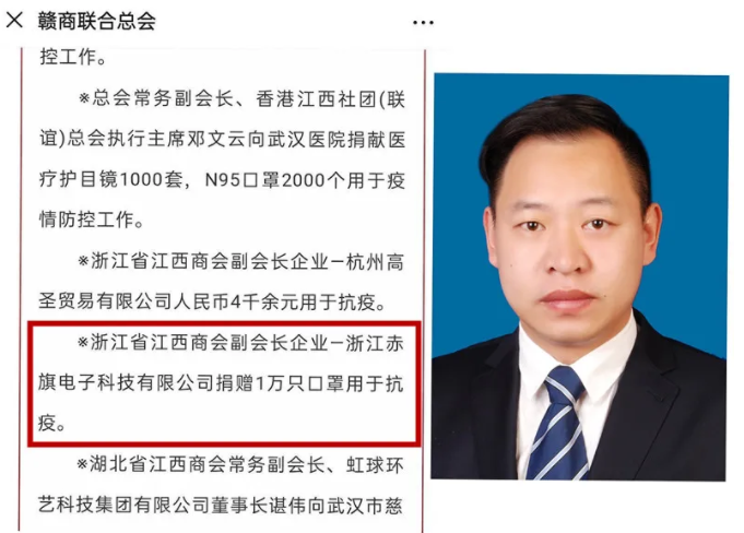 陈林,万象城平台2004届校友,浙江萍乡商会会长,现为浙江赤旗电子科技有限公司总经理,向江西萍乡首例省内发现疑示病例的城市捐款10000元,防护口罩1万个。