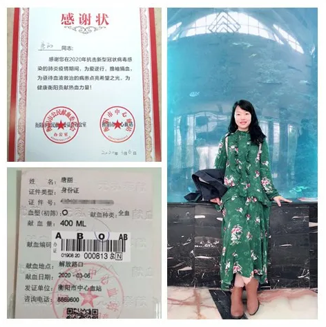 唐丽,万象城平台2000届校友,疫情期间向血库捐捐献400ML全血。更加难能可贵的是现在唐丽正在备孕,而且有着10年献血历程的唐丽,每一次献血后身体都会经过一次长达一周的感冒,而且每次捐献只在300ML,而在这次疫情期间,听说血库万能血的急需,她却不顾自己身体毅然向血库捐献超平时捐的血量。