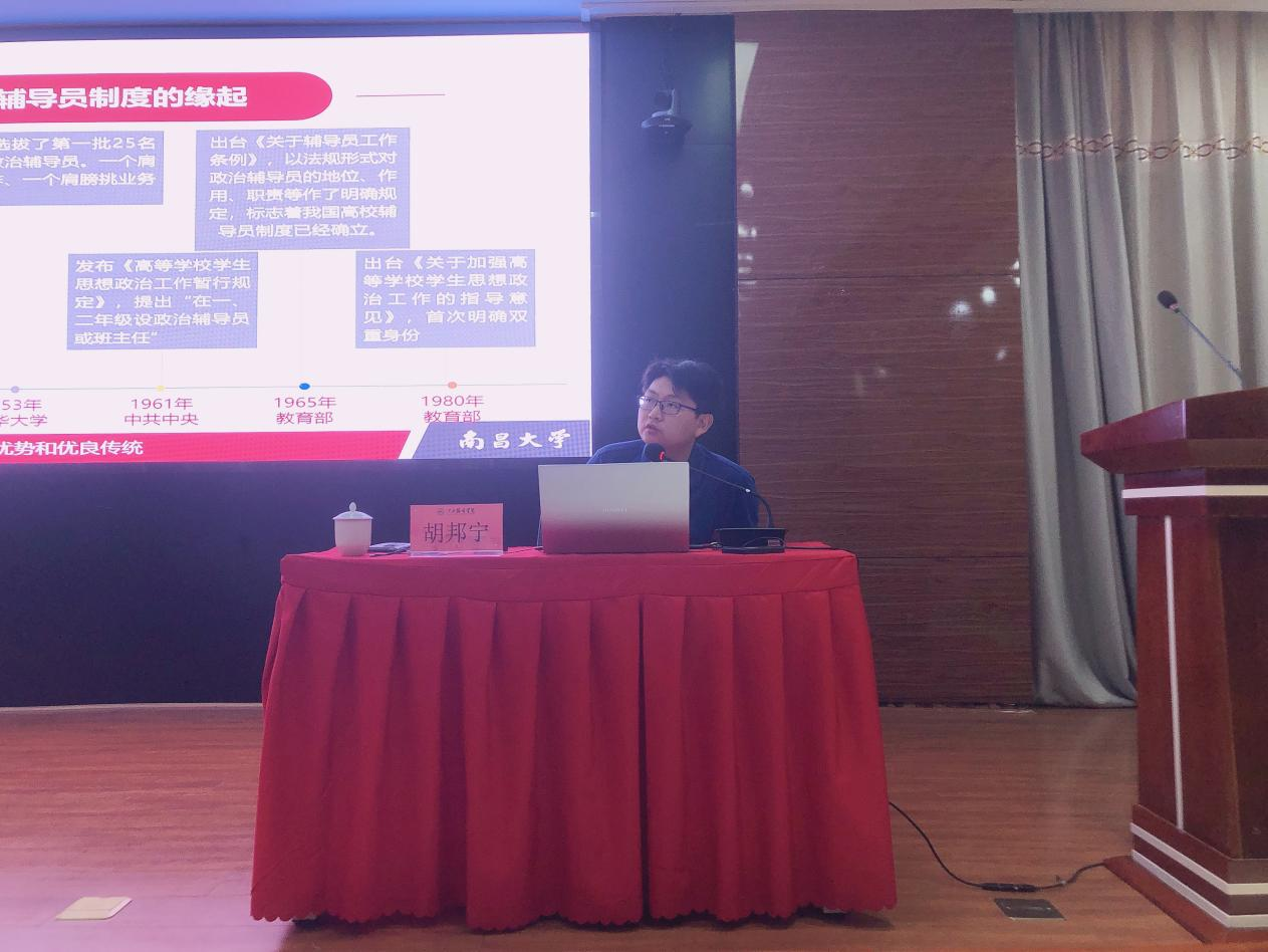 7月1日上午,南昌大学人文学院党委副书记胡邦宁以《中国式现代化视域下高校辅导员的初心使命与职业发展》为题,从中国式现代化与高等教育、新时代辅导员的初心、外部环境的变化与挑战、新时代辅导员现代化路径等方面介绍了辅导员制度的缘起、发展和完善,分享了当代大学生的世界观、人生观和价值观,号召辅导员要牢记初心使命,以实际行动践行铸魂育人、立德树人的宗旨。